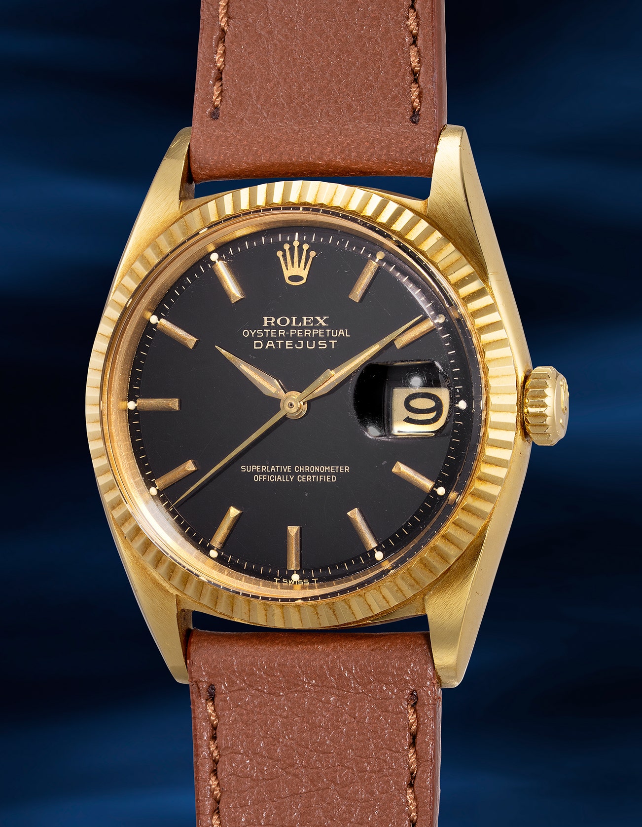 - This exemplary model epitomizes the Datejust mystique. Within the lustrous yellow gold case, fluted bezel and Cyclops lens, the glossy black dial provides an alluring contrast to the gold indexes.