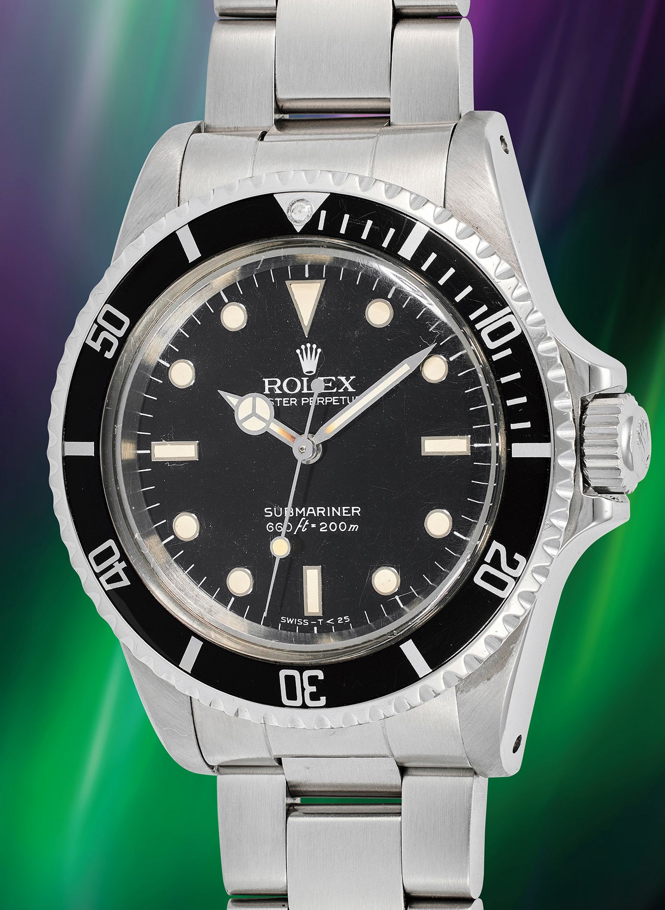 The present example from 1985 features the last dial variant, which over time, formed “spider” lines throughout the glossy lacquer. These small fissures are often subtle and often found on Rolex watches from the 1980s in particular the Submariner and GMT-Master. They have become a desirable trait for collectors of vintage timepieces offering the watch a unique trait since no two watches with “spider” lines will be the same. It is an added dimension to the authenticity and history of the watch.