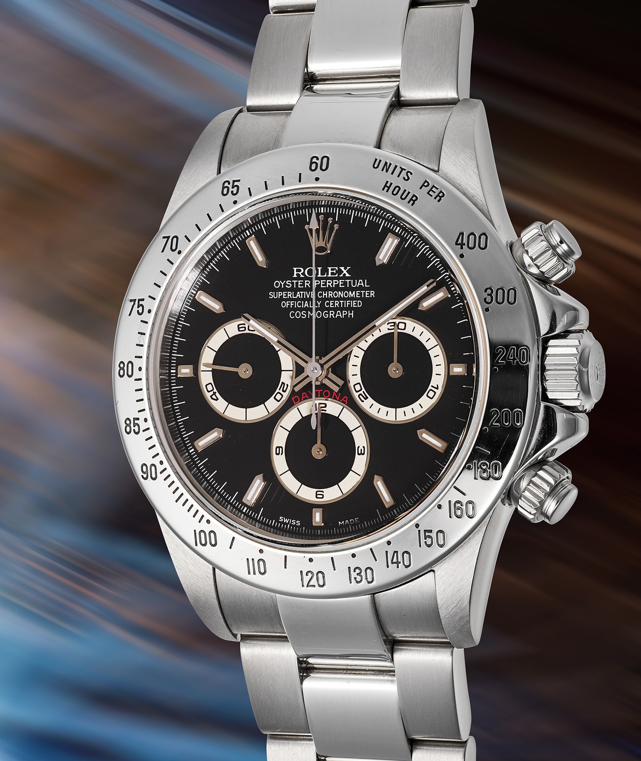 The present ”P” series model dates to 2000 and features the correct Mark III bezel with the “Units Per Hour” denoted by “240” replacing “250” and “225” found on earlier examples as well as “Officially Certified” again added to the dial for a 5-line Rolex signature. The watch is in pristine overall condition with hardly any signs of handling, even retaining its original and well-preserved green factory sticker on the caseback. The lot, a complete set, is accompanied by its original Rolex guarantee having been sold by M. Santarellie Hijo, Buenos Aires. The present Daytona is a wonderful timepiece and sure to entice all collectors.