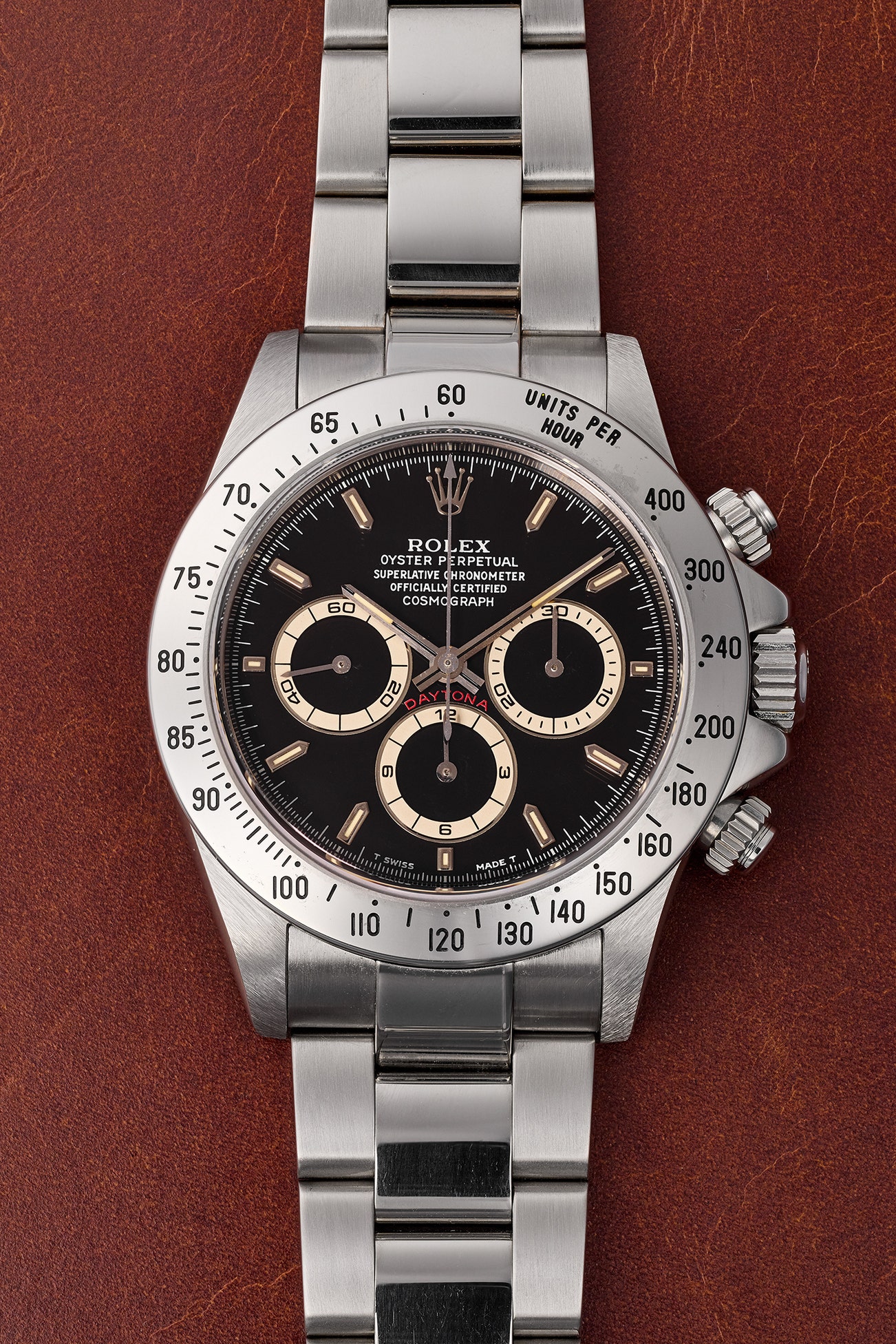 The present ”A” series model dates to 1998 and features the correct Mark III bezel with the “Units Per Hour” denoted by “240” replacing “250” and “225” found on earlier examples as well as “Officially Certified” again added to the dial for a 5-line Rolex signature. The watch is in near “new old stock” overall condition with minimal signs of handling and wear, and remains unpolished in our opinion. The present Daytona is a wonderful timepiece and sure to entice all collectors.