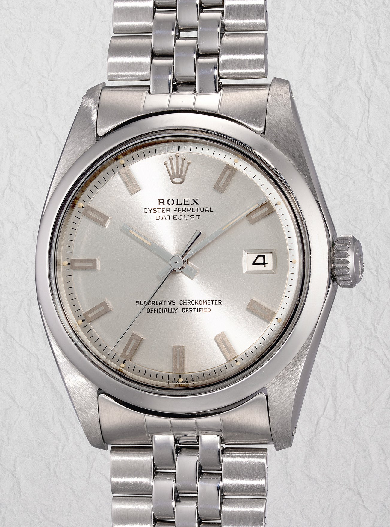 In a 1967-1968 catalogue, Singer presented numerous new designs, print techniques, markers, layouts, and finishes for various brands. One of the more unique and stunning dials is the present pie-pan dial with beautiful, funky block markers, a surviving design from the Singer books that went into production in very low numbers and is found in 4-digit Datejusts and even some exclusive Daytonas. The Singer stamp on the backside of the dial completes the provenance of this timepiece.
