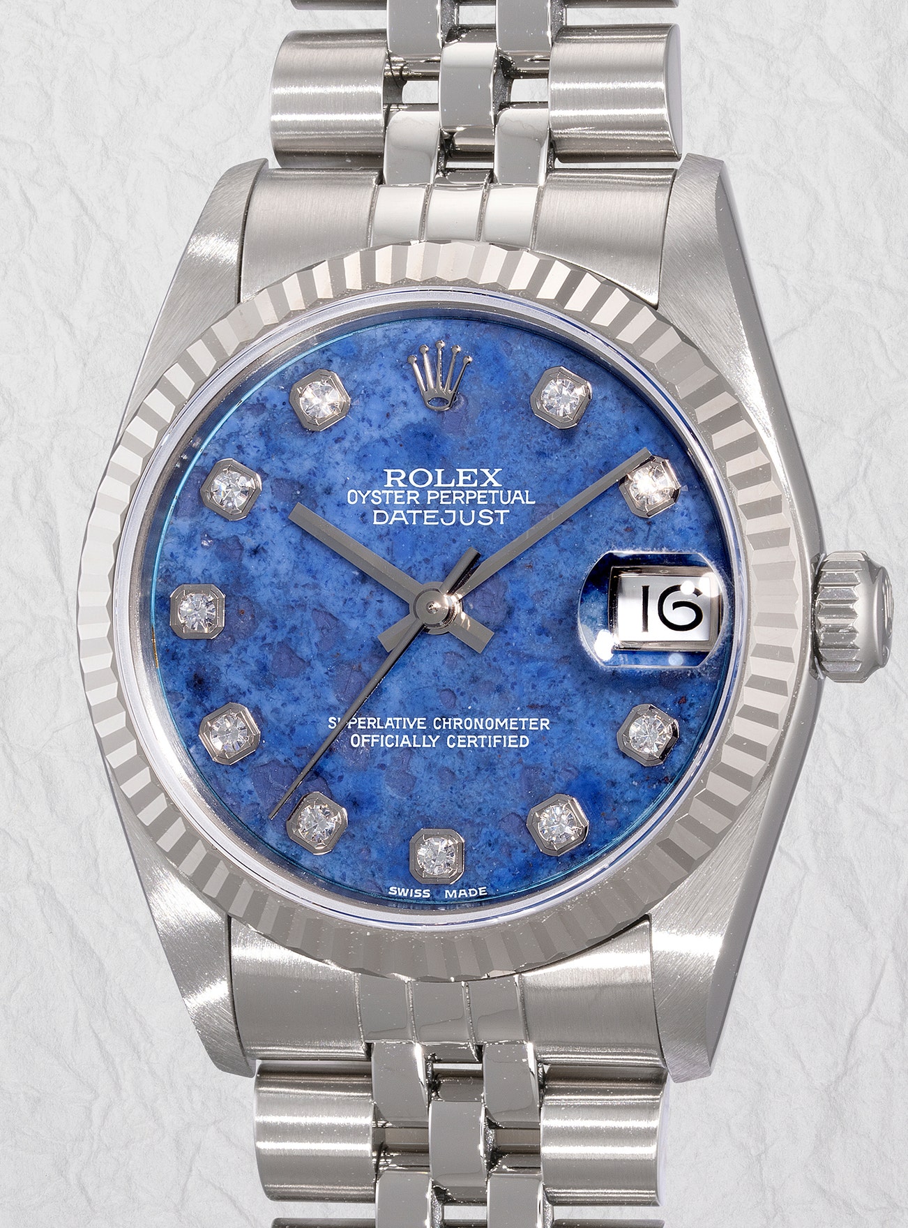 A very well-preserved and attractive lady's wristwatch with center seconds, date, blue sodalite dial, diamond-set indexes, bracelet, guarantee and presentation box