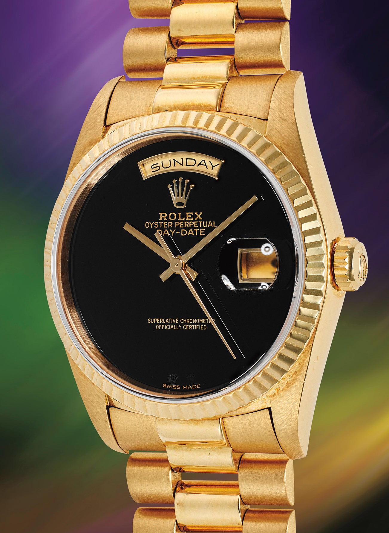 Notably, the present example is fitted with an inky black onyx hardstone dial. Onyx, a form of chalcedony with deep banded layers, is a popular stone used in jewelry and watchmaking. Historically, Roman soldiers went into battle with onyx amulets for courage in battle, engraved with the visage of the god of war, Mars. The slice of onyx used for the dial of this Day-Date is utterly flawless, with attractive gilt printing. Presented as a “full set”, complete with its original box and punched guarantee, it’s a lovely example for the connoisseur.