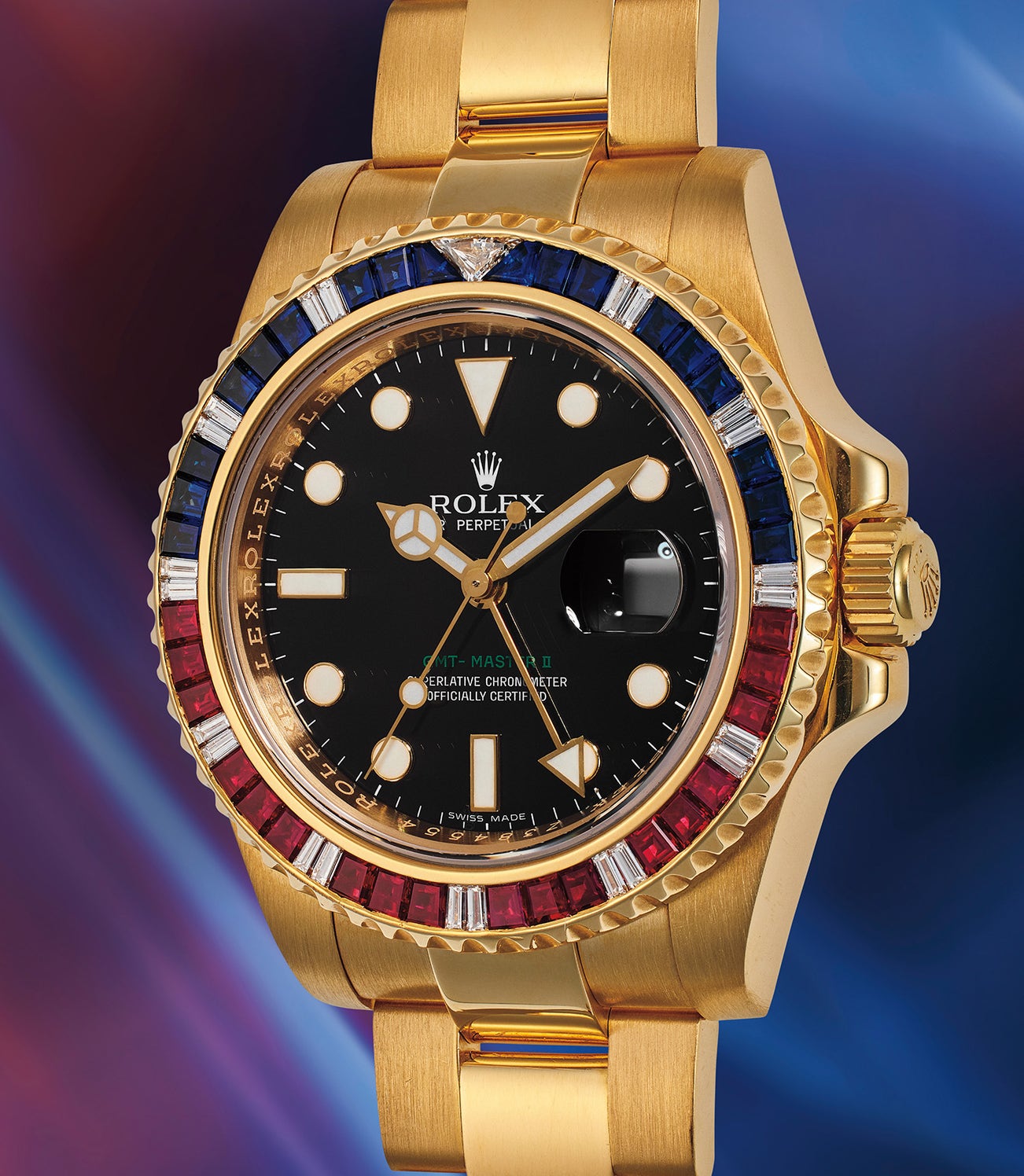 Following in the footsteps of the reference 16758, the first Rolex sports wristwatch to be fitted with precious stones – notably, the ruby, sapphire, and diamond-set bezel reflecting the identifiable “Pepsi” bezel of the stainless steel variant. The updated case and movement that was introduced with the 116748 continued to be called “SARU”, and was made available in yellow, pink, and white gold. Now discontinued, the present, well-preserved example is offered with minimal signs of wear with vibrant and internally flawless sapphires and rubies on its bezel, accompanied by a service card and presentation box.