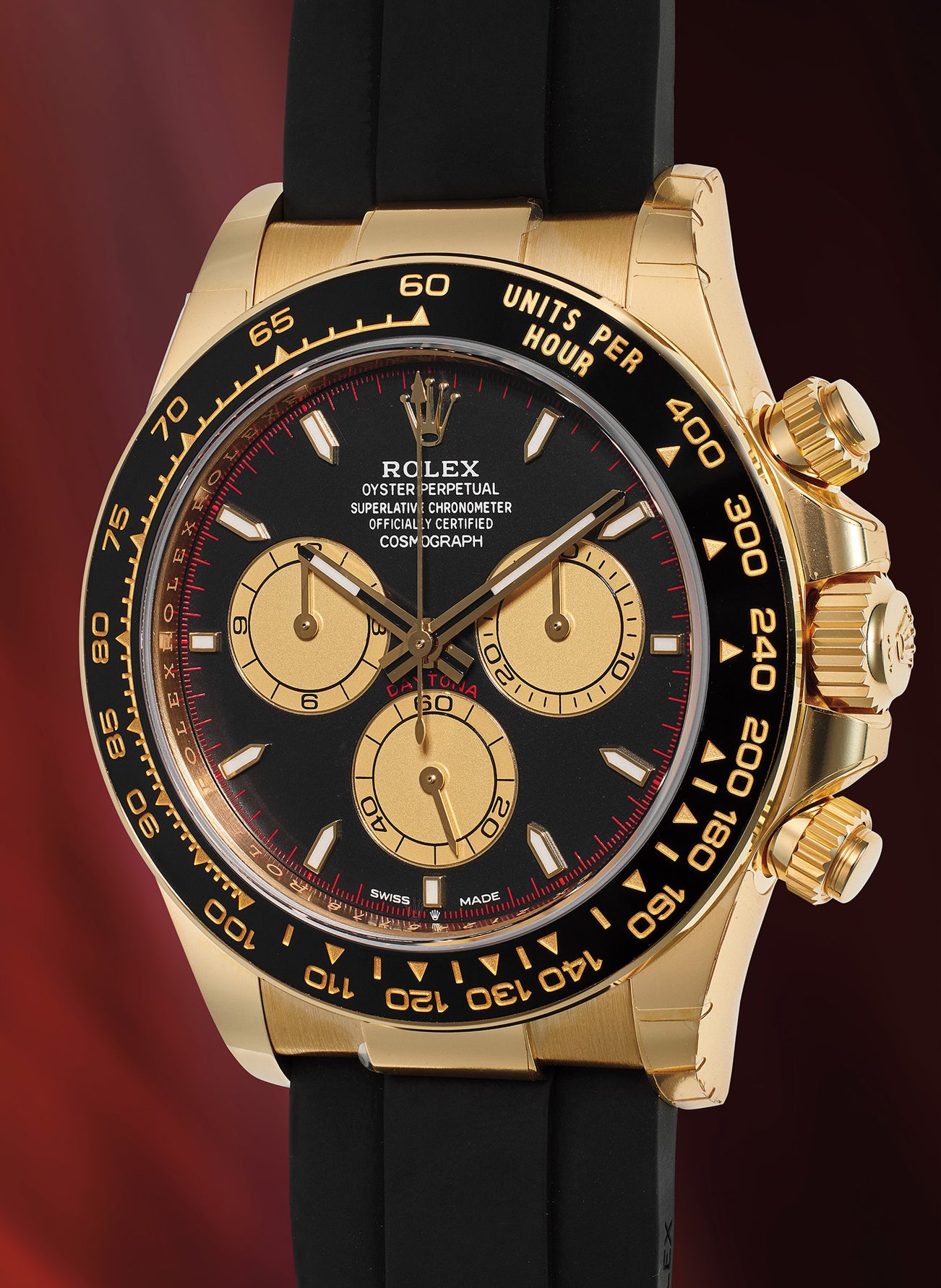 The new classic chronograph has a modern appeal offered with either golden or a bright black dial like the present watch. The smaller hour markers have a vintage feel reminiscent of the reference 16520, and high nighttime legibility with Chromalight blue luminescent hour markers. The Cerachrom ceramic bezel is highly durable with tachymetric scale made with the deposition of a thin layer of platinum in the numerals and graduations via a PVD (Physical Vapour Deposition) process. Furthermore, the chronograph features the brands sporty Oysterflex bracelet.