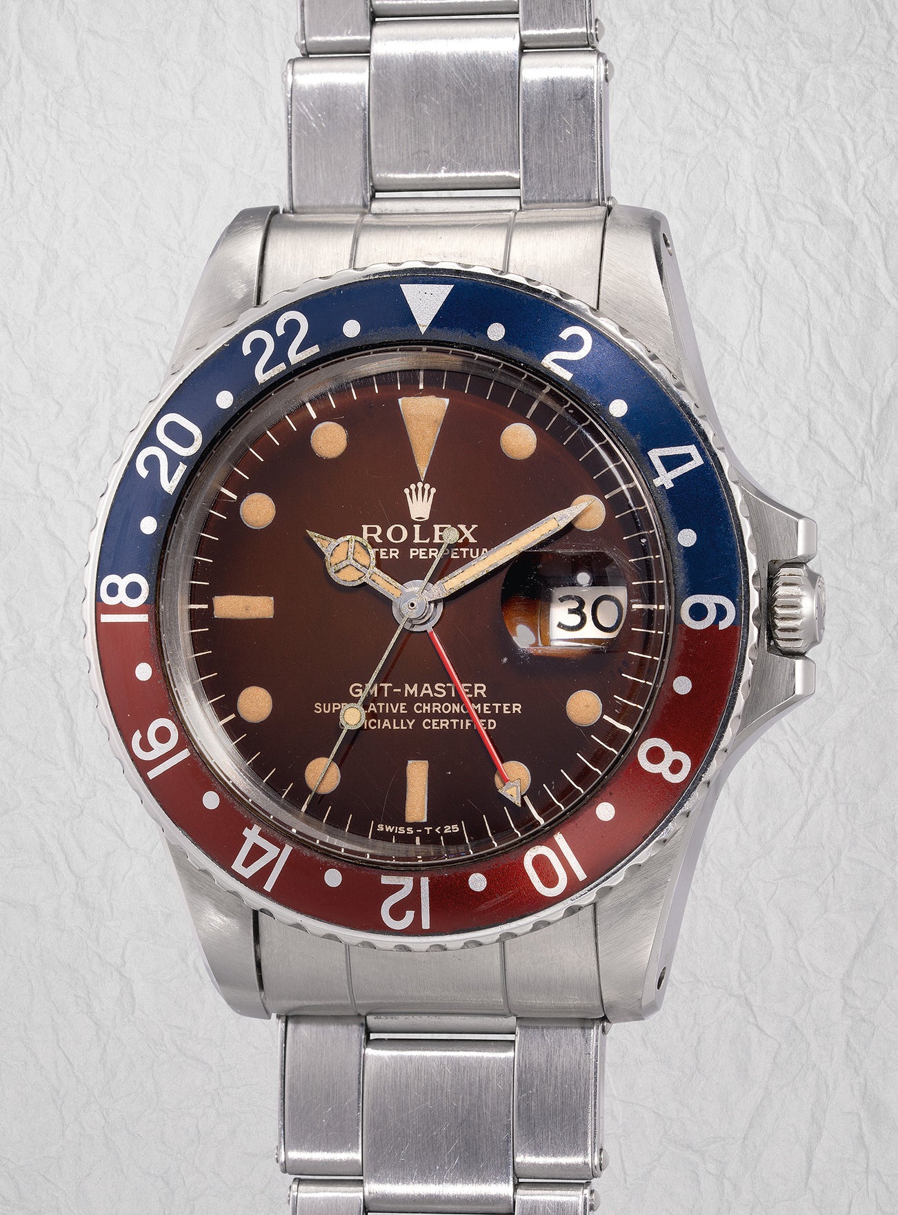 Early examples of the ref. 1675 featured desirable “glossy” gilt dials similar to its previous model ref. 6542. The present example from circa 1966 belongs to one of the last examples of “glossy” gilt dials of the reference before its transition to matte dials. Boasting an incredible attractive “tropical’ dial, its rich brown hue and its warm caramel lume plots will court collectors with its charm. The case retains its defined lug bevels and crisp edges, the period correct bezel retains its rich ‘Pepsi’ colours. Unmistakably one-of-a-kind and well-preserved by a Japanese collector, your hunt for a coveted “tropical” 1675 is over.