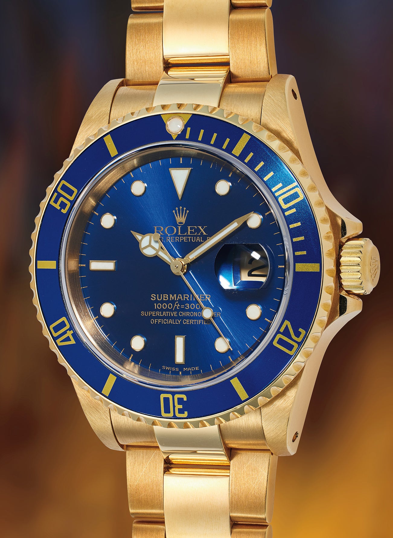 An attractive, sporty, and well-preserved yellow gold diver’s wristwatch with date, bracelet, guarantee, and presentation box