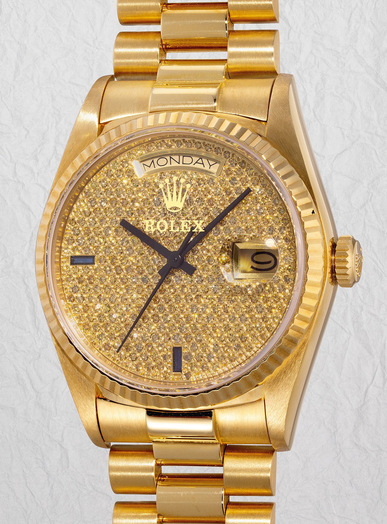 A well-preserved yellow gold wristwatch with center seconds, day, date, pavé yellow diamond-set dial with sapphire-set indexes and bracelet