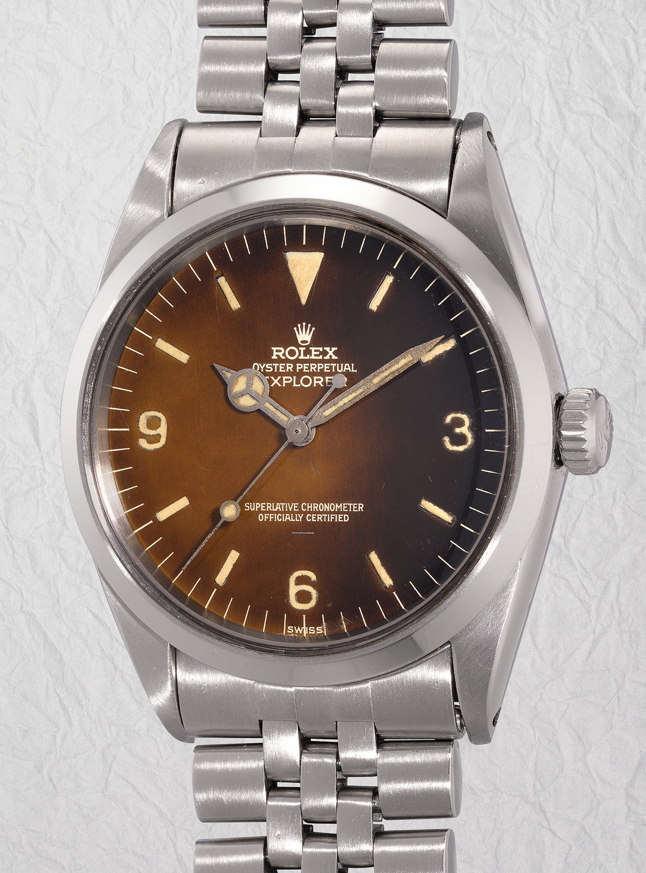 What immediately captivates the eye is the exquisitely aged "tropical" brown patina that has developed over the years, transforming the original jet-black dial. Adding to its allure, this particular piece bears an "underline" beneath the SCOC signature. Rolex collectors and historians speculate that this underline may indicate Rolex's transition to using tritium on the dial instead of radium.
