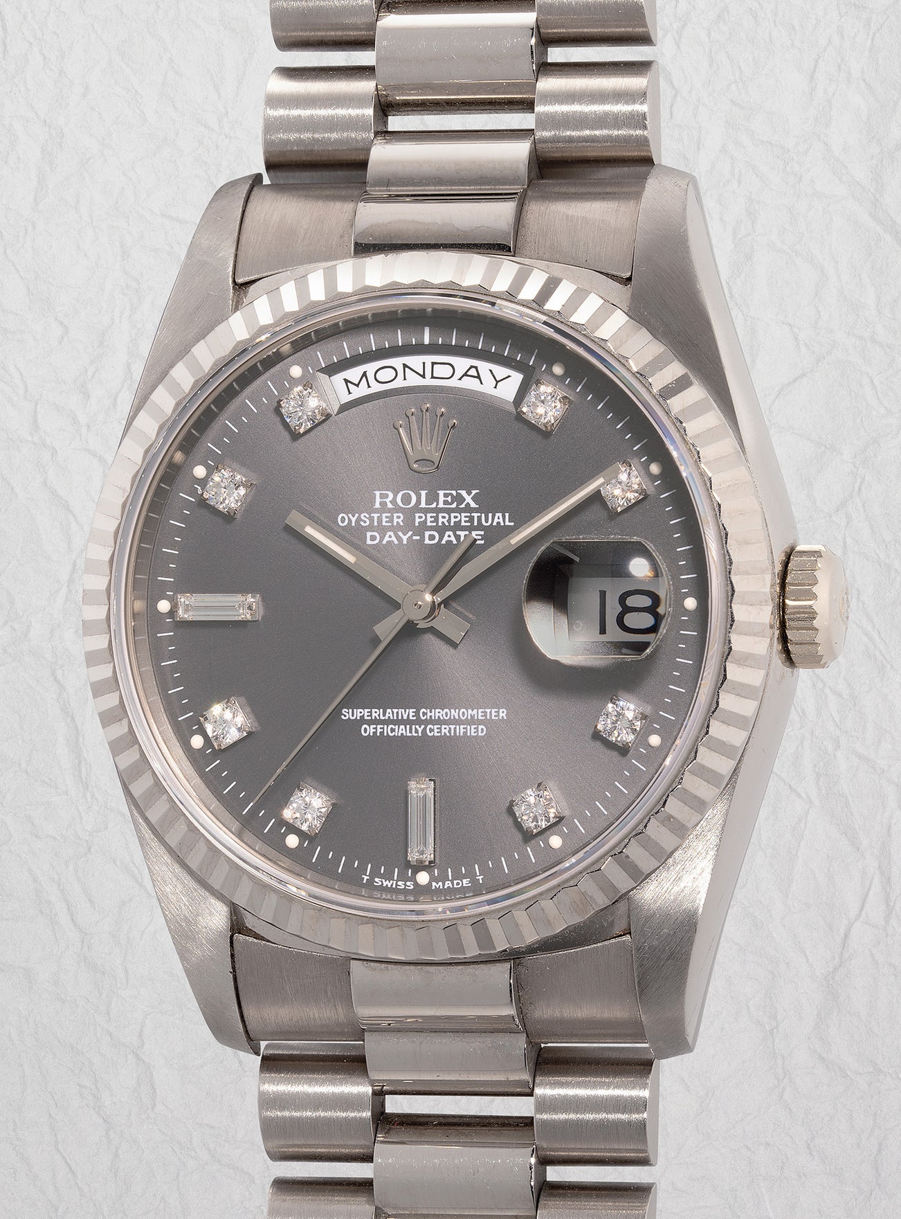 A well-preserved white gold wristwatch with center seconds, day, date, diamond-set grey dial and bracelet