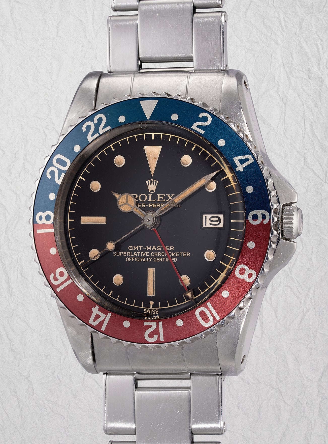 This vintage GMT-Master has been meticulously preserved for over six decades. Its exceptional case condition, highlighted by broad factory bevels on the lugs, is a detail highly sought after by collectors. Paired with the original Rolex Japan certificate, SCOC certificate, and presentation box, this timepiece is further distinguished by Its dazzling glossy gilt dial, embellished with uniformly aged luminous plots that harmonize with the patina on the hands, showcases a lovely yellow hue, further enhancing the watch's vintage charm and desirability among collectors.
