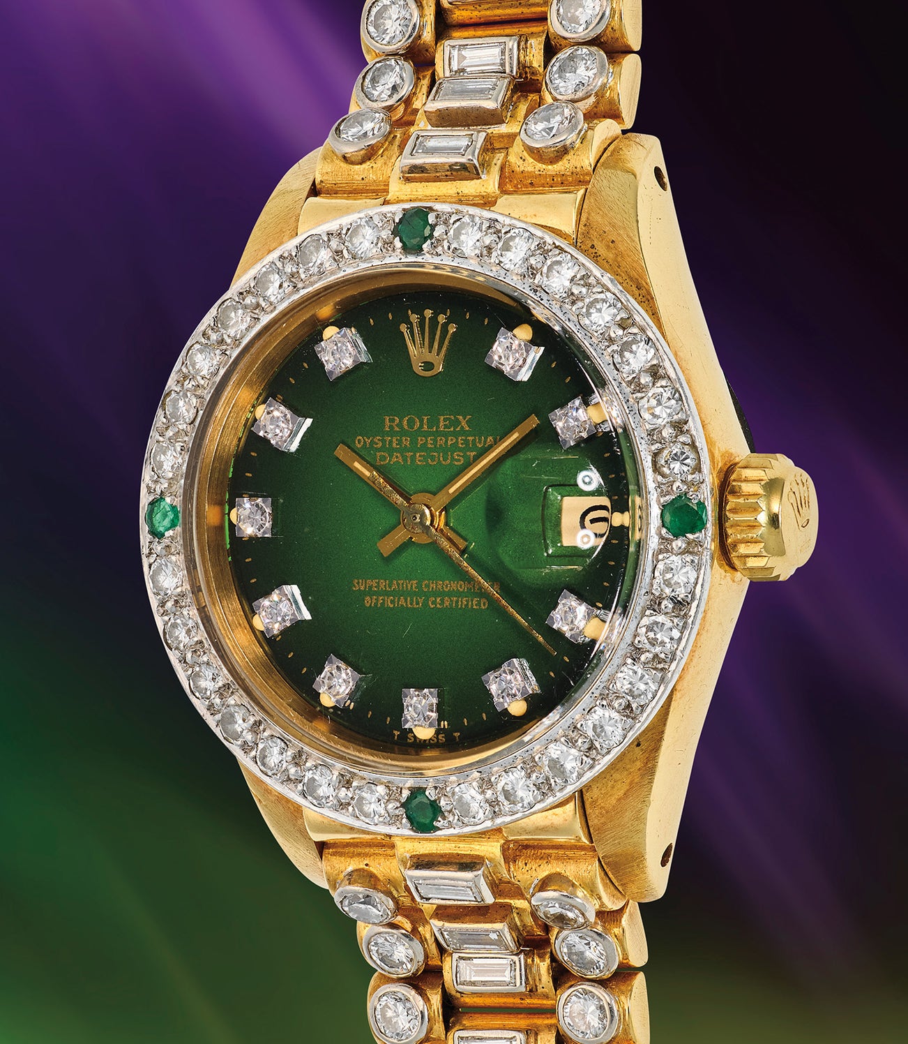 Of outstanding quality, the present watch is a magnificent and extremely rare Datejust that exemplifies the best of Rolex gem-setting of the 1980s.