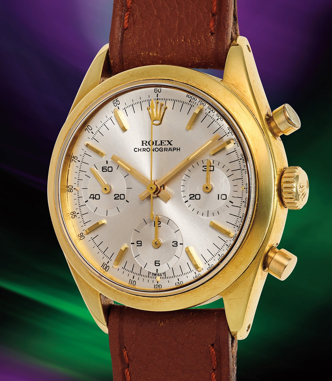 The minority of the reference 6238 was cased in 18K yellow gold, such as the present watch. It is fitted with a silvered “sunburst” or “soleil” dial that appears on later examples and closely resembles the dials of the next generation Daytona. The present example, bearing a case number dating it to 1963, has a beautifully preserved dial and a strong case in overall excellent condition.