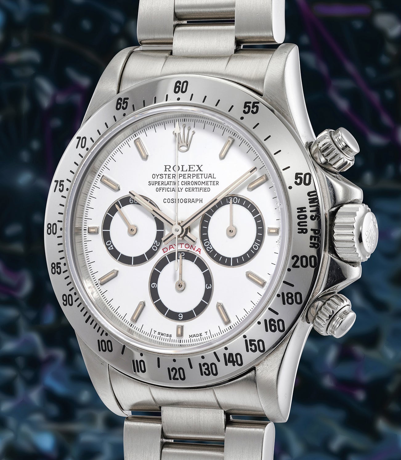 Indeed, while reference 16520’s popularity has increased dramatically in the past years, few automatic Cosmograph Daytonas are as beloved as the first-generation models ‘R Series’. As opposed to later examples, the Cosmograph script sets further apart from the first four lines of text, as if floating in the middle of the dial. Of particular note is the “inverted 6” on the 6 o’clock subsidiary register, highly appreciated by collectors today. The reference 16520 was the first Daytona to be fitted with a sapphire crystal, and with a larger case diameter measuring 40 mm, which was equipped with the rare 200 graduation bezel. Later examples would have a bezel calibrated to 400 units.