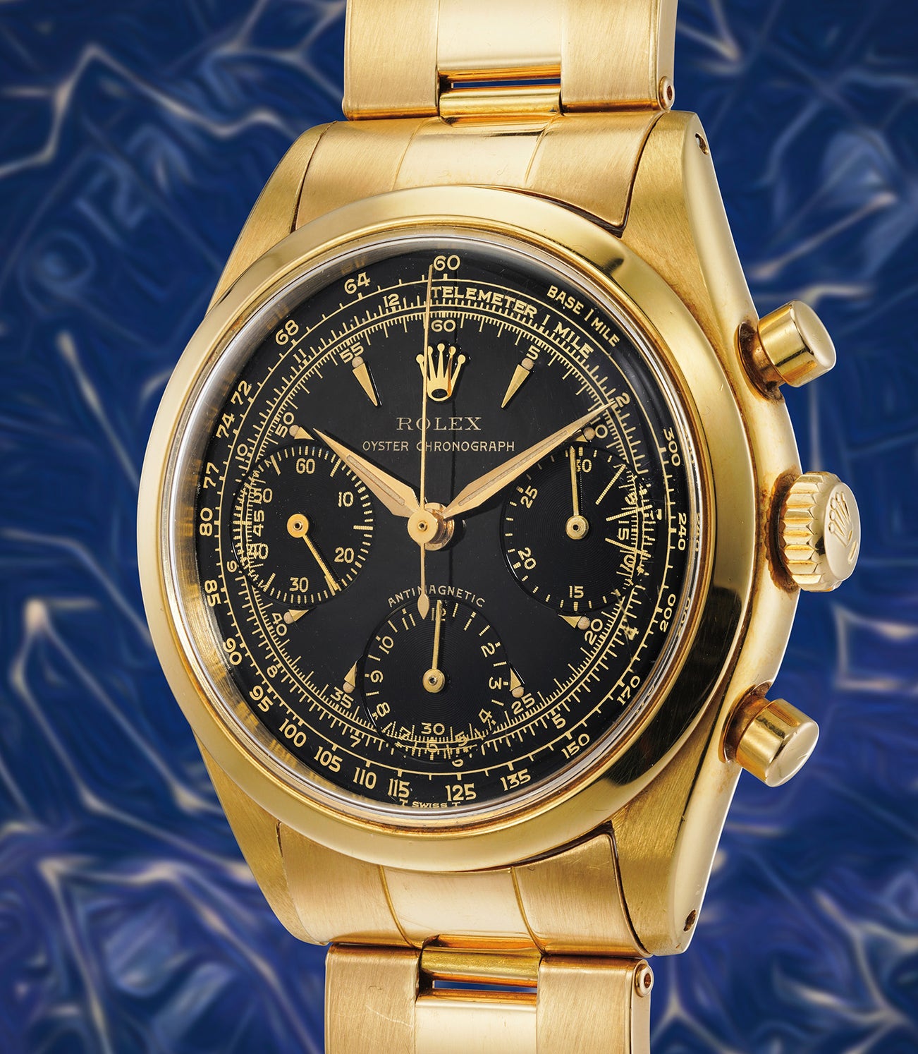 An absolutely superlative example, the present lot bewitches the beholder with its exceptionally well-preserved black glossy dial; while most black glossy vintage Rolex dials tend to age with clouding, bubbling or patina - more or less strong according to its conservation history of course - the present one arrives to us in an astounding condition, fully maintaining its glossy sheen. The "transitional" dial, which is correct for the serial number, furthermore features full luminous dots that display a warm patina, matching the hands. With a serial number that dates the timepiece to approximately 1964, it was during this period that Rolex started to switch from "Swiss" dials, to those displaying "T Swiss T" to reflect the addition of tritium on the dials.