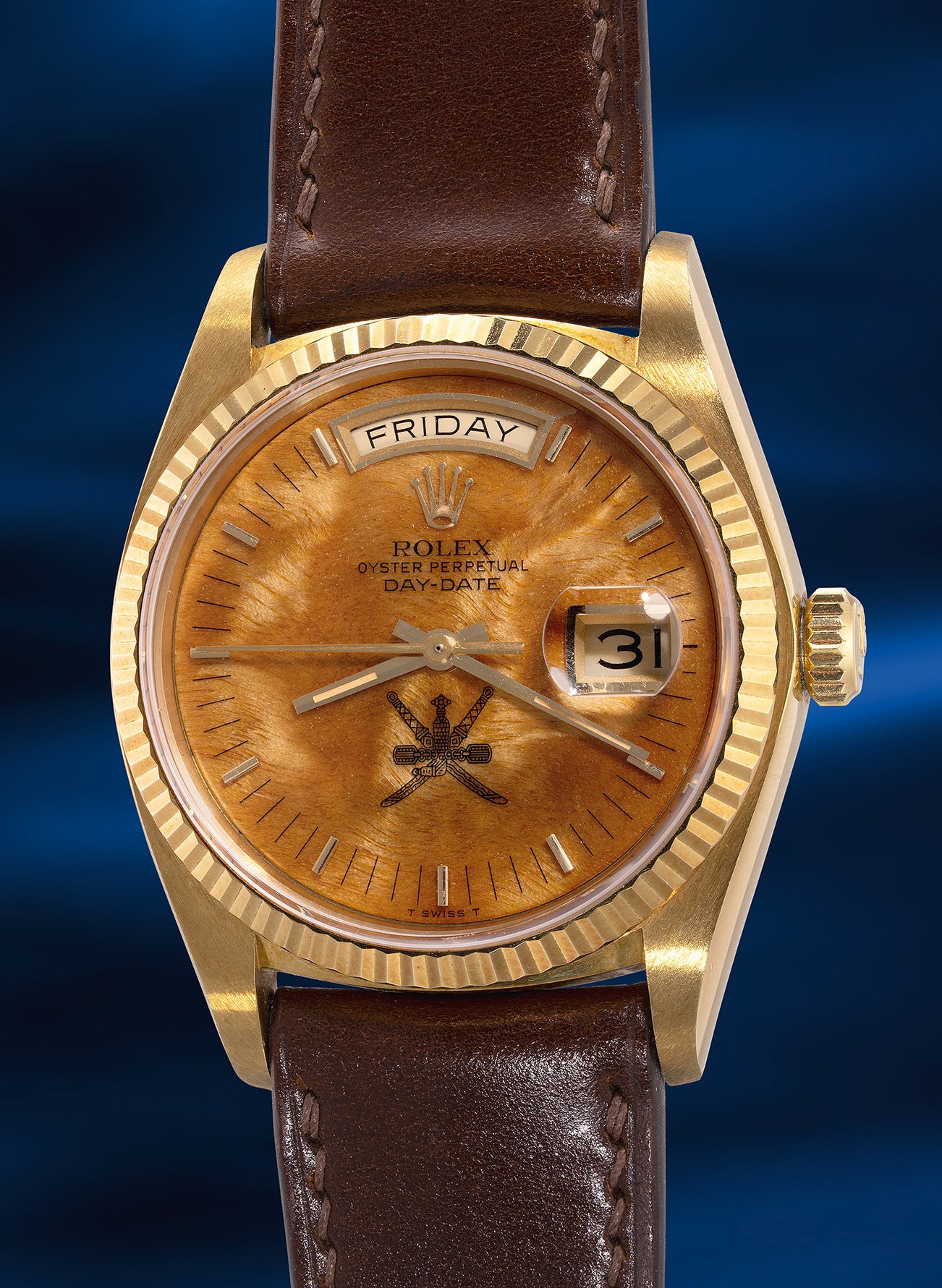 A very rare and well-preserved yellow gold wristwatch with center seconds, day, date, wood “Khanjar” dial and guarantee, made for the Sultanate of Oman