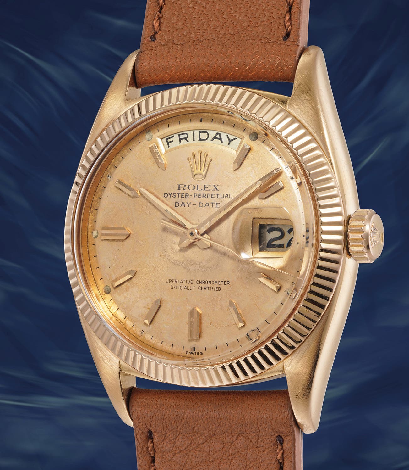 A historical pink gold calendar wristwatch with center seconds, gifted to Egyptian president Gamal Abdel Nasser by Sheikh Fahd Al Salem al Sabah of Kuwait