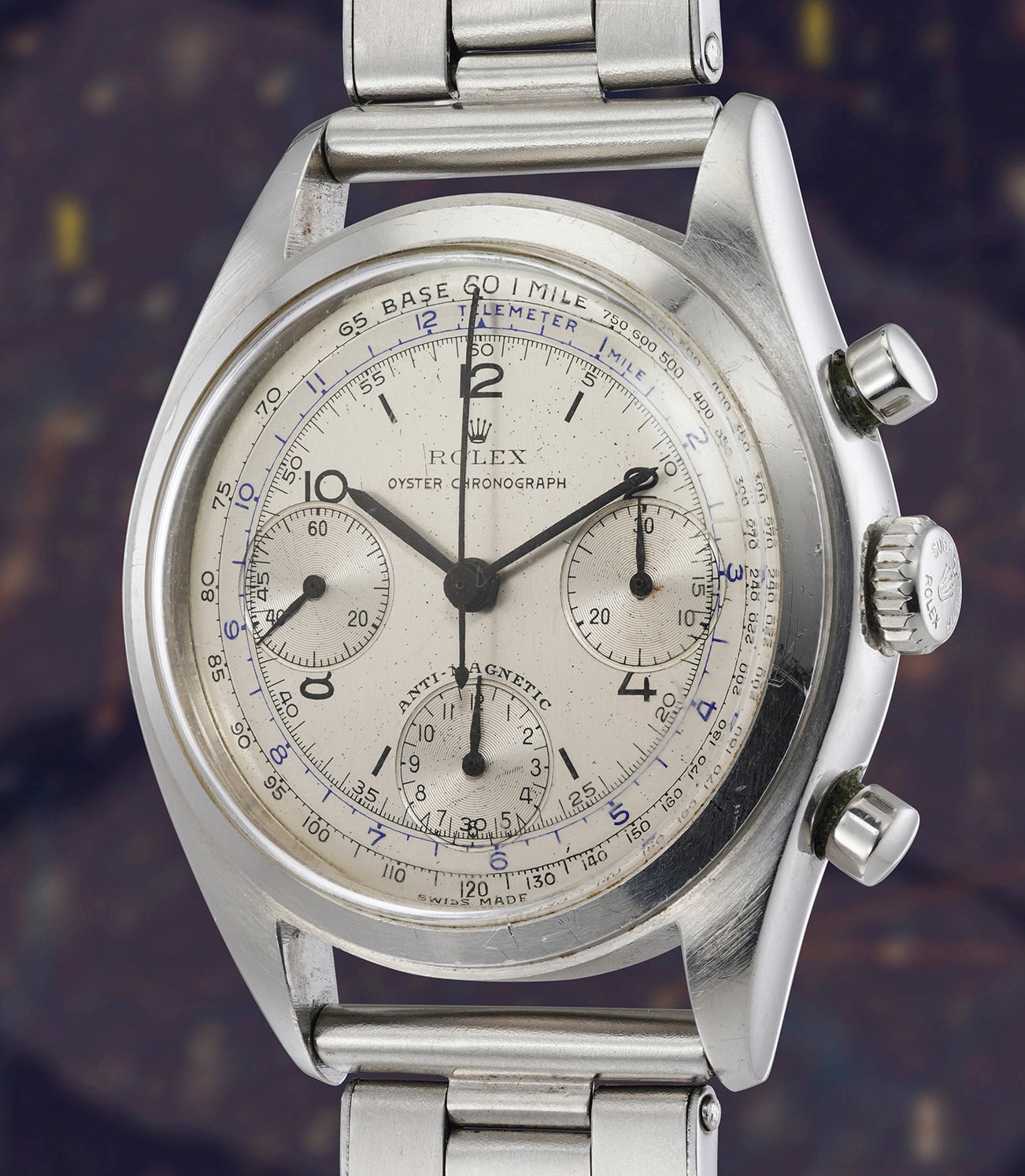 Indeed, the watch employs an Oyster case, paving the way to what would become one of the most popular designs of the 20th century: the coveted Cosmograph Daytona. Worth noting is that Rolex considered such a design an Oyster one - as mentioned on the dial - even though it lacks screw-down pushers. Only after their introduction of the ref. 6240 would the pushers be considered a fundamental part of an Oyster case (and indeed 1970s ref. 6262 and 6264 with pump pushers do not usually bear the “Oyster” designation).