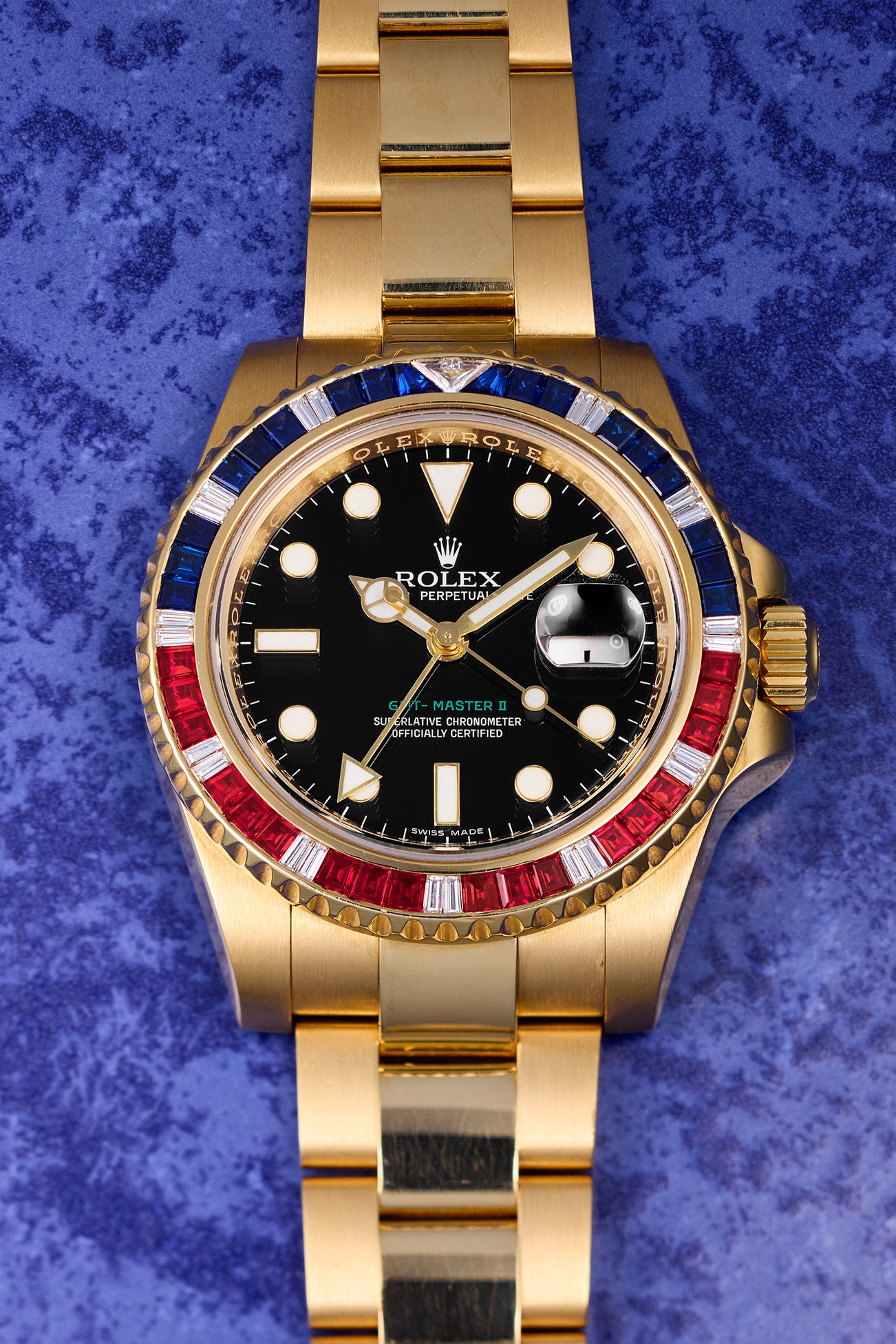 • Following in the footsteps of the reference 16758, the first Rolex sports wristwatch to be fitted with precious stones – notably, the ruby, sapphire, and diamond-set bezel reflecting the identifiable “Pepsi” bezel of the stainless steel variant. The updated case and movement that was introduced with the 116748 continued to be called “SARU”, and was made available in yellow, pink, and white gold.