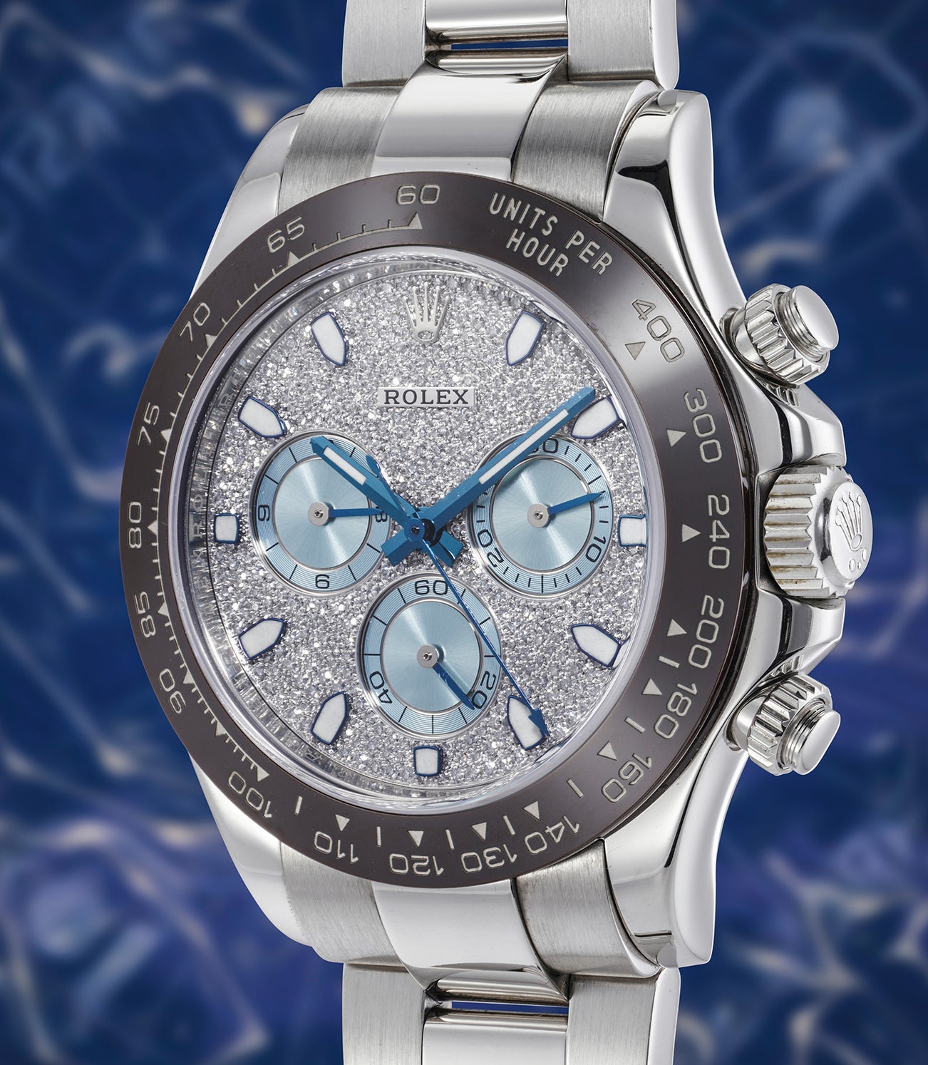 The present watch is an incredibly exclusive version, fitted with a diamond pavé dial with ice blue subsidiary registers, giving the watch an even more glamorous touch. Ice blue is used exclusively on platinum models by Rolex, including the Day-Date, Datejust and the present Cosmograph Daytona. Preserved in excellent condition, the present watch is is a classic that will never go out of style.