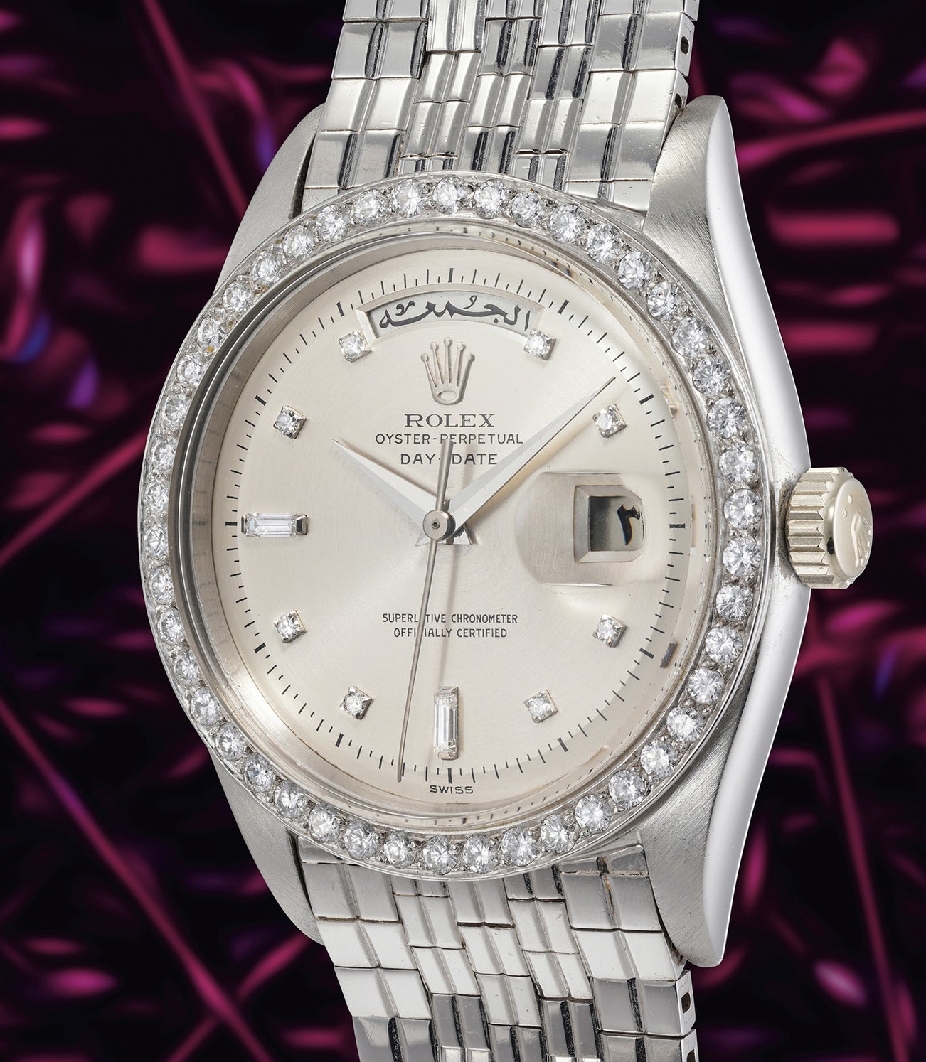 Thus, it is apparent that the present piece presents traits that might categorize this watch - according to some collectors - as the most desirable of this restricted bunch. Not only is it one of two examples with the Eastern Arabic calendar, but it furthermore sports one of the most elusive dial finishes that can be found on a Day-Date: the circular satin finish. Among the most notable, beyond the aforementioned 6613, one cannot avoid to mention the "Big Kahuna" 6612, sold by Phillips at the historical “Glamorous Day-Date” sale for the remarkable amount of 473’000 CHF in 2015.
