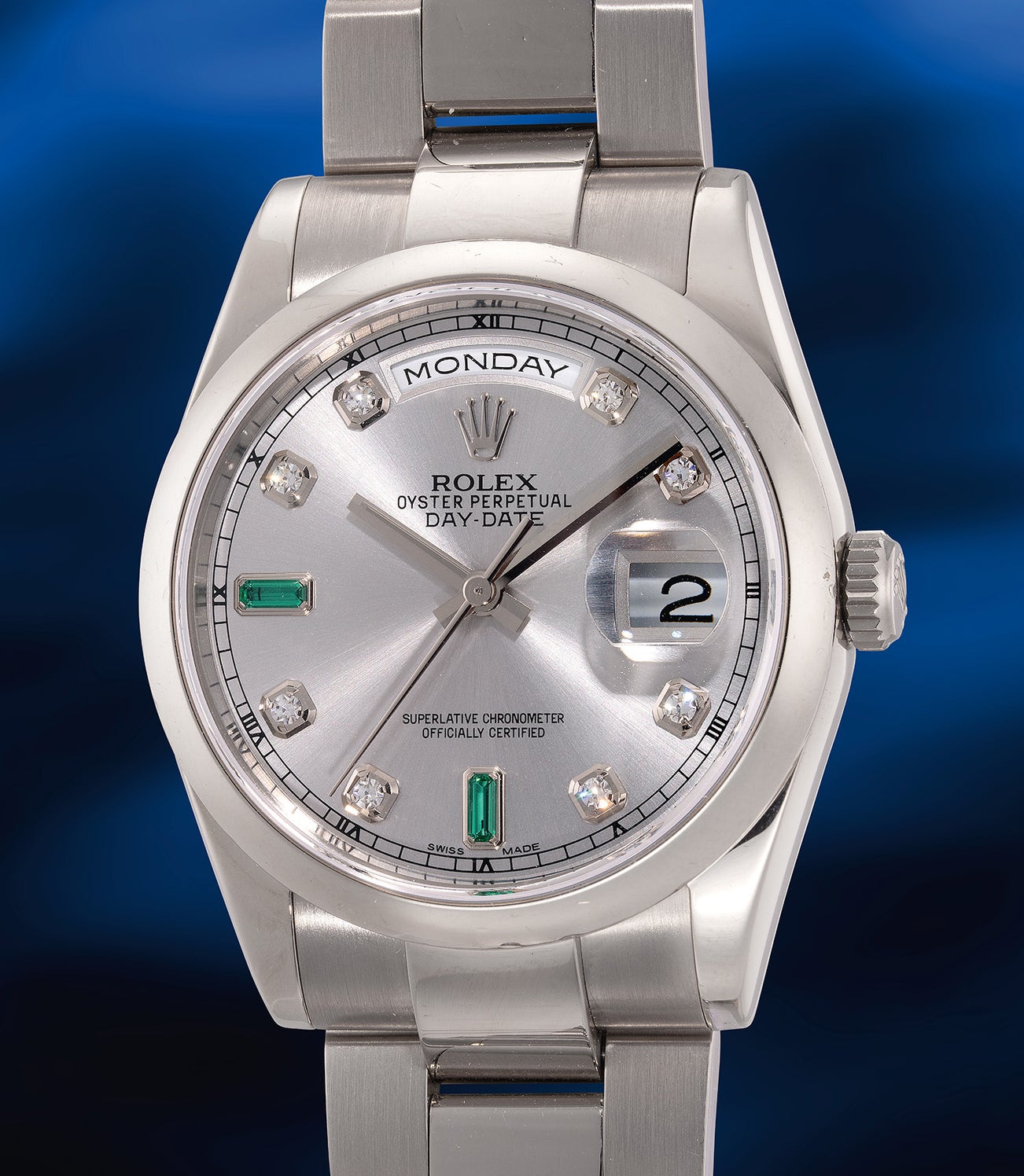 Distinguished by its white gold case, the present ref. 118209 is not just an ordinary example but one fitted with a sophisticated silver dial with emerald and diamond-set indexes, a combination that is visually arresting and gives the watch its incredible appearance. Bearing a “Y” serial dating back to circa 2003, the present Day-Date’s condition is astonishing, still retaining its sharp edges and proportions, this is a rare example to come across, especially with the emerald-set indexes at 6 and 9 o’clock, that true Day-Date collectors should not miss.
