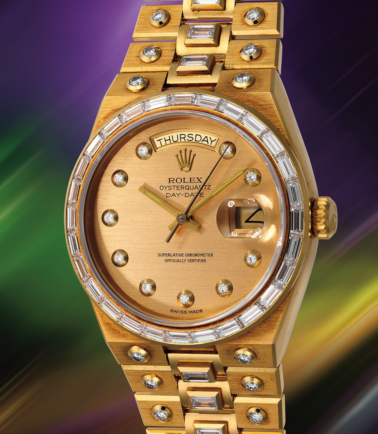 No expense was spared, as even the bezel is adorned with baguette diamonds – Rolex ’s most costly option. In overall superb condition, the present lot is a true collector's piece, with hardly any signs of wear as evidenced by the presence of the original green factory sticker on the caseback.