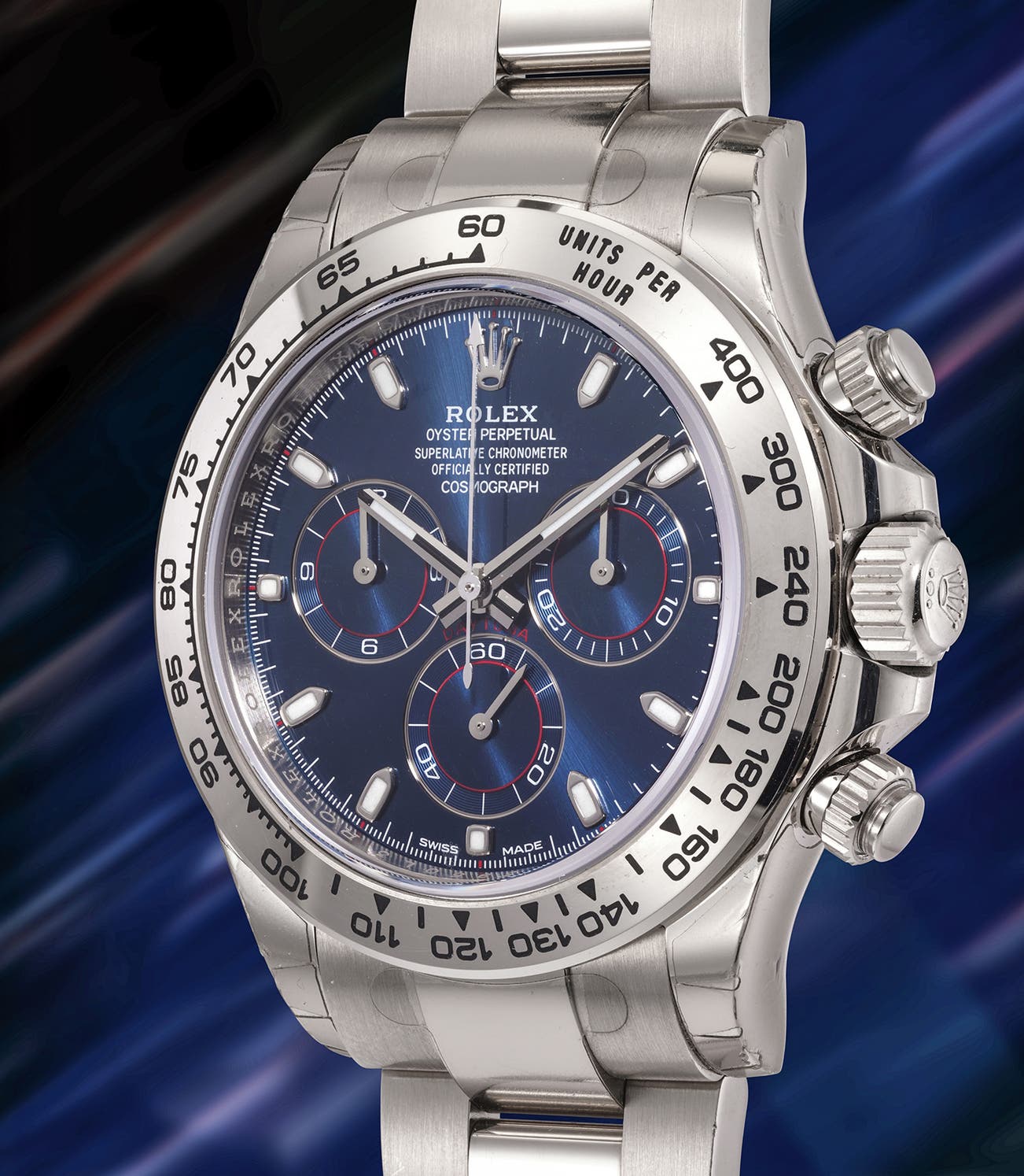 Crafted entirely in 18k white gold, the watch balances sporty design with refined elegance, powered by Rolex’s in-house chronograph calibre 4130.
