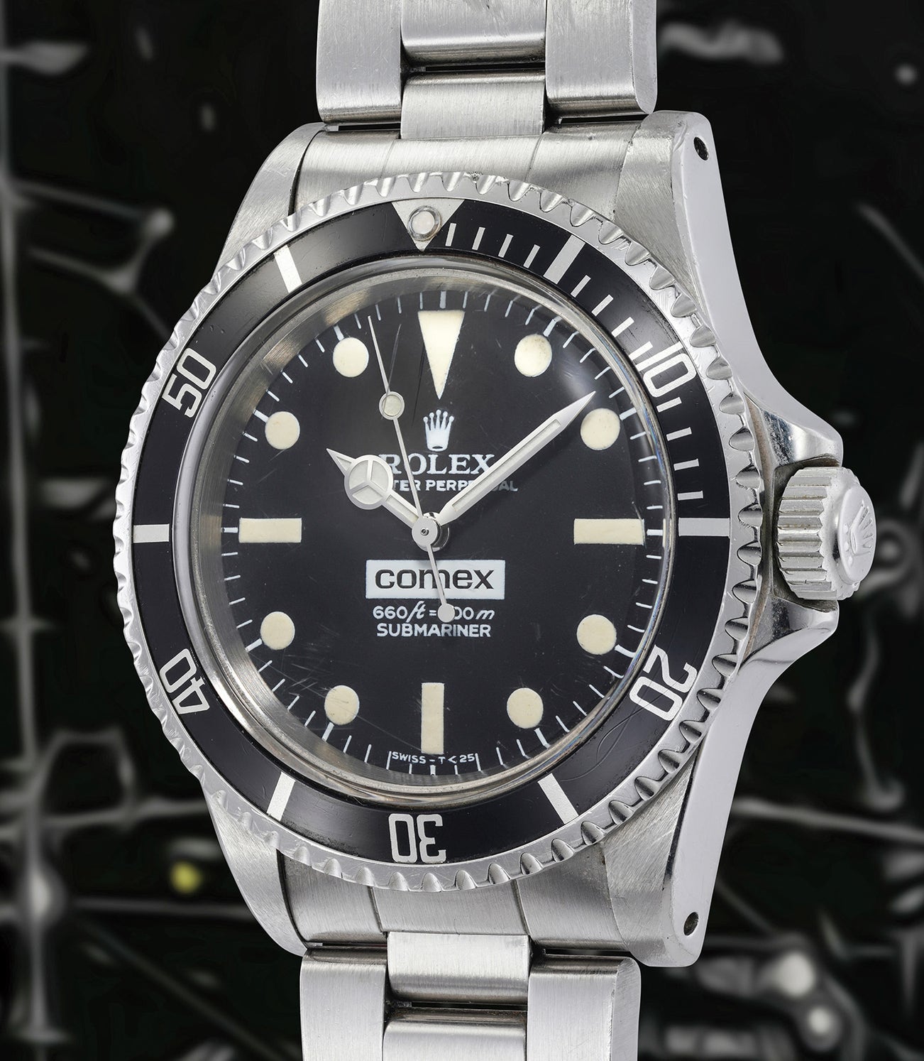 The present example is a stunning representation of the ref. 5514, featuring the COMEX name prominently on the dial and engraved on the caseback, along with the COMEX issue number, 806. Later examples, like this one, display the COMEX engraving around the edge of the caseback rather than straight across. Additionally, this watch features the largest "big numbers" style for the issue number, adding to its appeal.