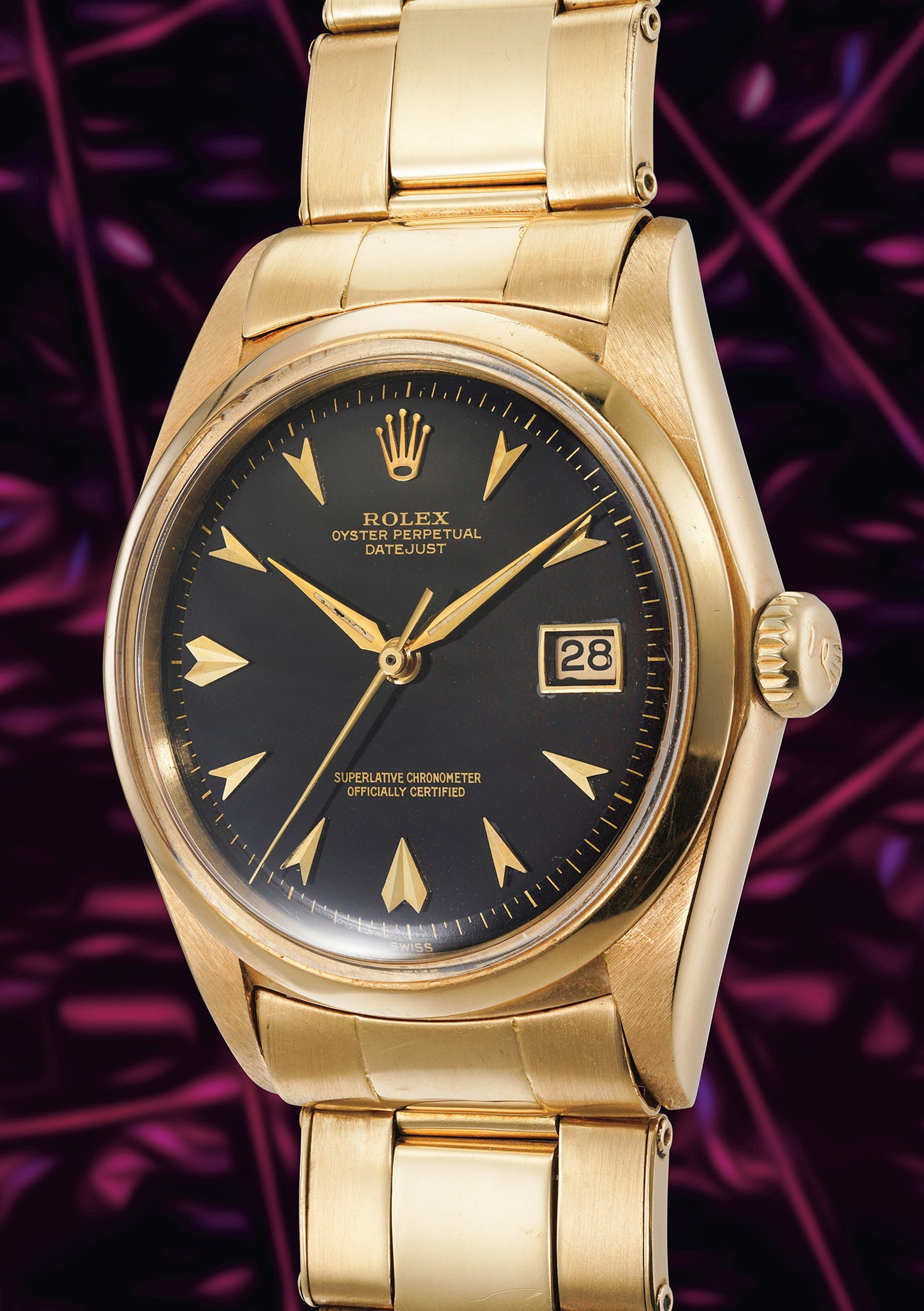 The Datejust reference 1600 offers a smooth bezel that brings a more simplistic touch to the fluted and crenellated bezels of its siblings, reference 1601 and 1603. The reference was in production from 1960 to 1976 and was made in various metals including stainless steel, gold and steel and gold. The present watch impresses with its attractive black lacquer dial, which is incredibly shiny and mirror-like, despite the age of the timepiece.