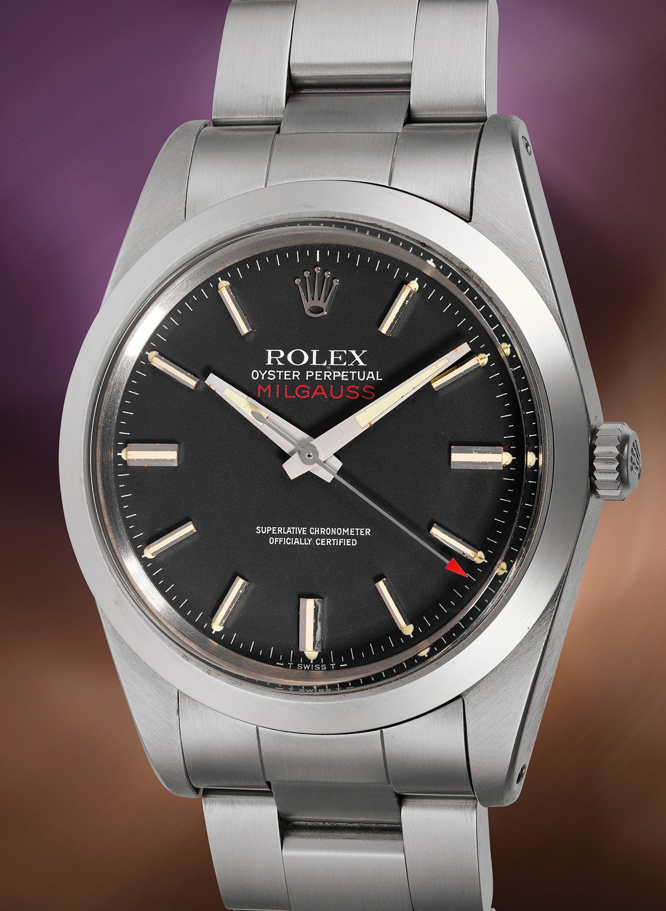 The result was the Milgauss, deriving its name from the Latin “mille” meaning a thousand, and “Gauss” representing the unit measure for magnetism. Accordingly, it could withstand exposure of up to 1000 Gauss with no effect on accuracy, whereas a typical watch movement can only withstand up to 70-90 Gauss. In the early 1960s, the newly introduced Rolex Milgauss reference 1019, like the present lot, replaced the original two versions: references 6541 and 6543. Significantly thinner than its predecessors, it was manufactured until 1990 and was available only in stainless steel.
