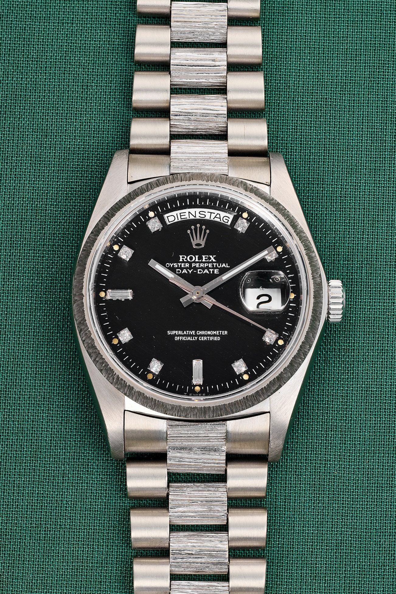 • This highly attractive Day-Date is fitted with a glossy black diamond dial that perfectly harmonizes with the elegant white gold case. An ultra luxurious, refined pairing, it is set apart by its lovely state of preservation. This combination, combined with the German date wheel, is seldom-seen and an exciting opportunity for the collector.