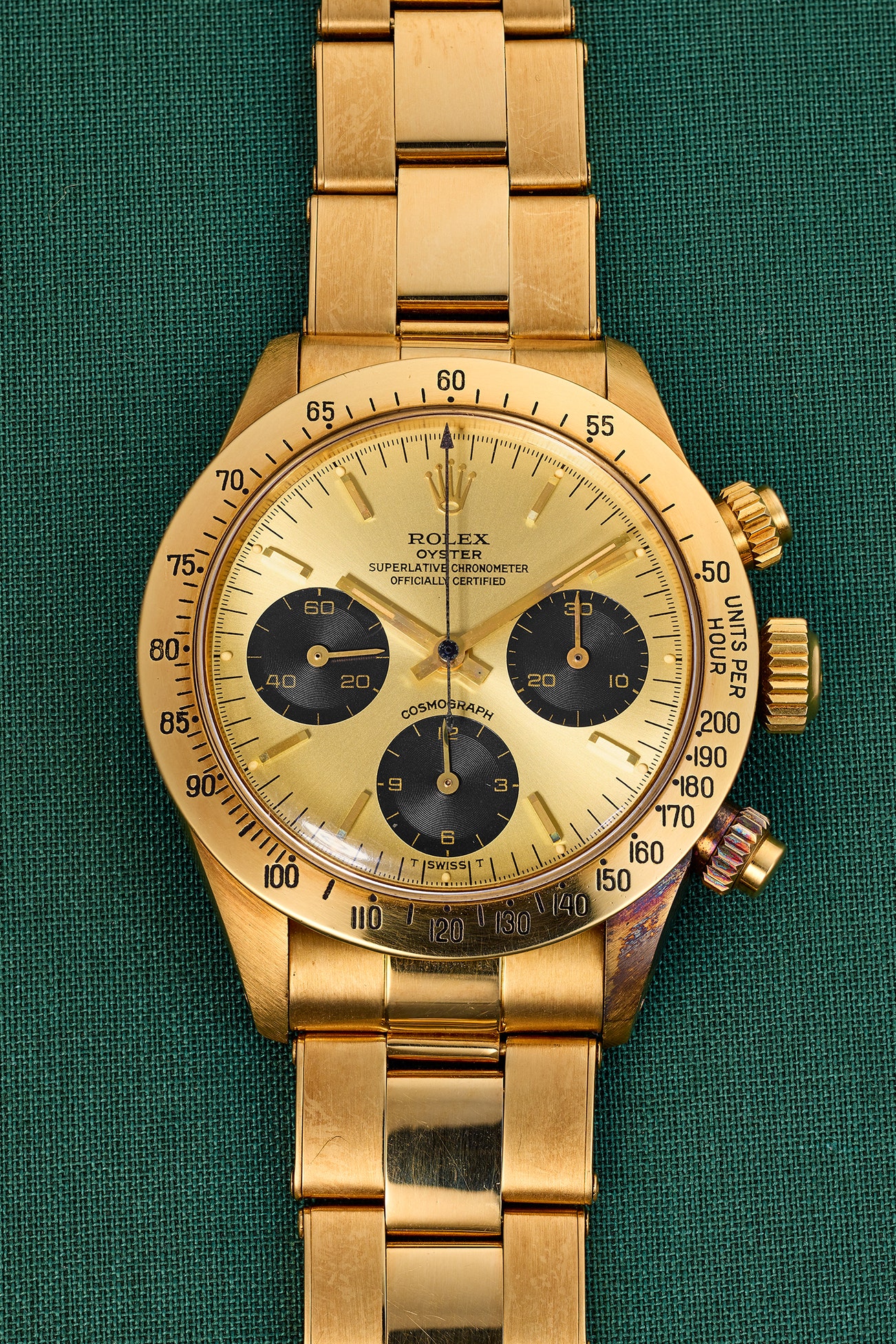 • One of the properties of the Rolex caliber 727 (found on references 6262, 6263, 6264, and 6265) is that it had the potential to be regulated as a chronometer. While, however, steel Daytonas were not certified by COSC, the gold versions, doubtlessly due to their higher prestige, were indeed sent to COSC for certification. Thus, with some very early exceptions, they bear already the script now ubiquitous on all Daytonas: Superlative Chronometer / Officially Certified.