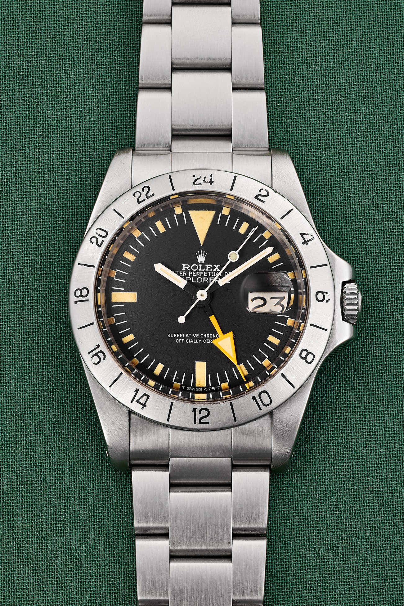 -- The reference 1655 was in production through the mid-1980s and released with a total of five different dial types. The present watch displays the “Mk 4” dial with “T SWISS < 25T” with serif font, which is correct for the serial number. The present watch is nicely preserved and a prominent yet uncommon model within the Rolex product line since it was first introduced.