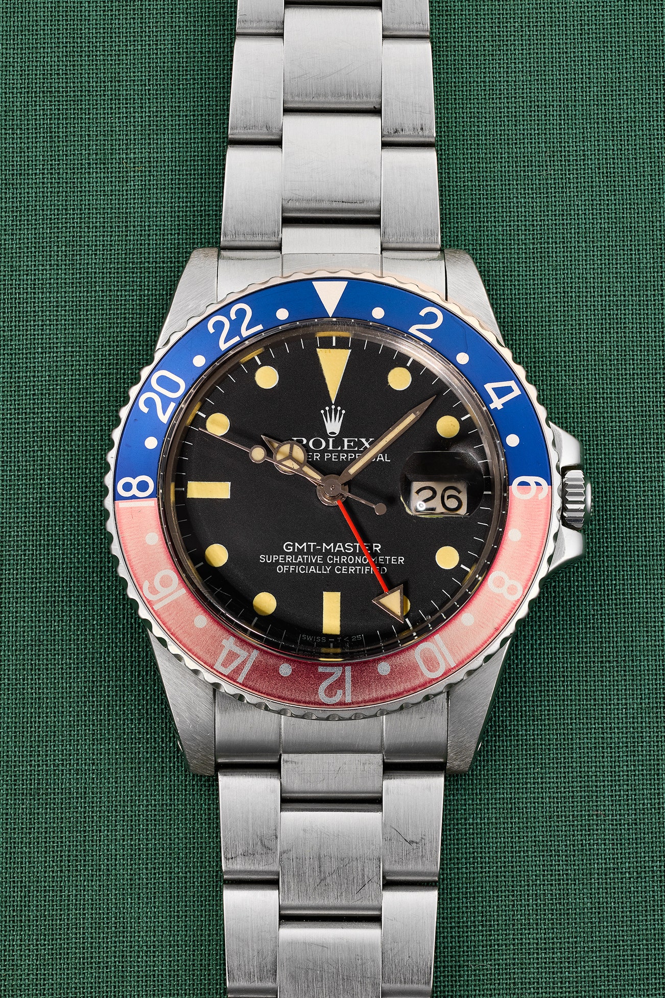 --The present model, from circa 1979, is well-preserved and a wonderful representation of the GMT-Master. Fitted with an early matte dial, the reference 16750 was initially offered with matte dials for only the first approximately three years of production. By 1983, Rolex would switch to the use of glossy, lacquered dials with white gold luminous hour markers, making matte dial examples uncommon and sought after. The dial of the present example is nicely aged with the luminous numeral plots faded to a light yellow hue. The reference 16750 was only in production until approximately 1988, making this a rare opportunity to own this modern grail watch.
