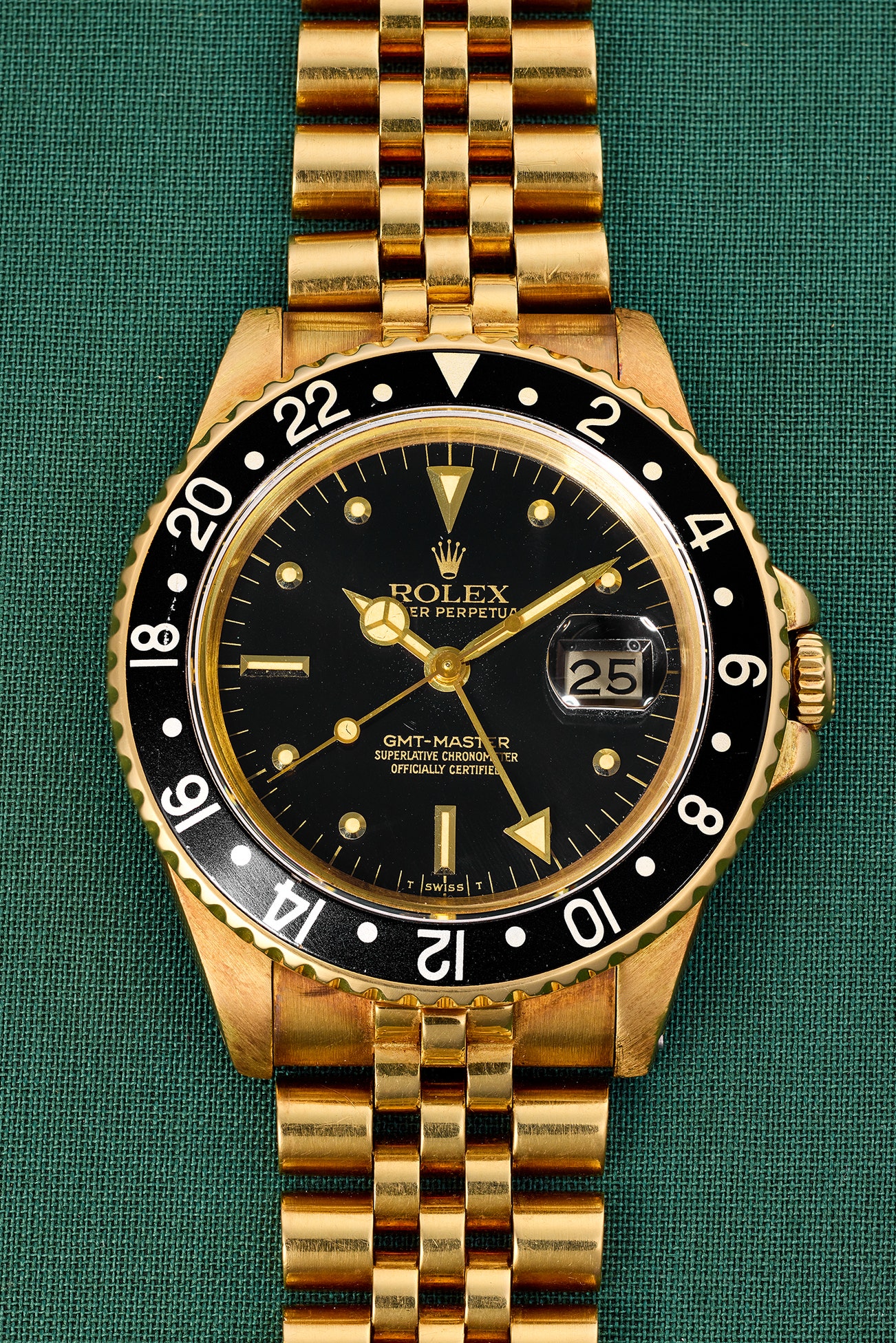 --The reference 16758 was introduced at the end of the 1970s as the yellow gold variant of the newly released 16750 in stainless steel. Both featured the upgraded caliber 3075 with quick-set date mechanism and a depth rating of 100 meters. The yellow gold variant was a luxury evolution of the line and was the first GMT Master model to be fitted with a sapphire crystal as well as the first Rolex sports watch set with precious stones.