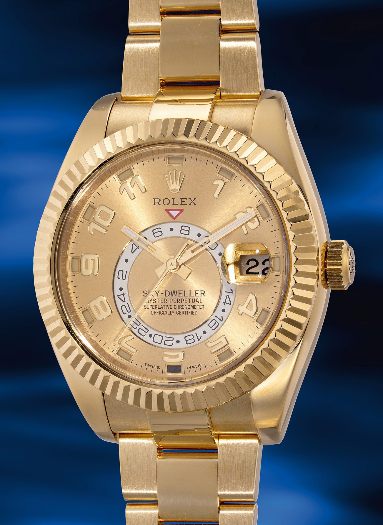 The Sky-Dweller exemplifies the pinnacle of luxury within the collection. The warmth of the yellow gold case and bracelet creates a visually arresting contrast, exuding both sophistication and opulence.