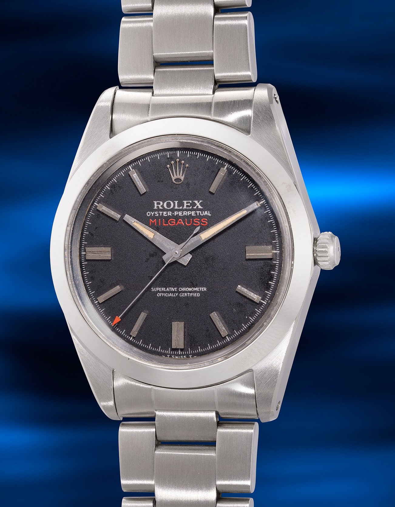- As an extremely niche tool watch, the Milgauss was never a commercial success, resulting in low production numbers. The present example features a black matte dial that highlights the striking red triangle on the seconds hand and the red "Milgauss" text at the 12 o'clock position, making it a sought-after piece among collectors.