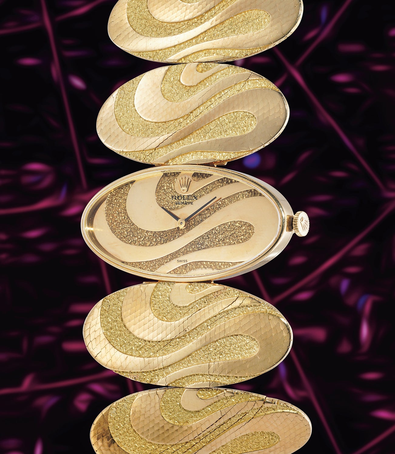 The revered jewellery designer Georges Lenfant designed the present timepiece in 1970. Lenfant is a notable jewellery designer who produced spectacular creations for some of the world’s most prestigious brands, including Van Cleef & Arpels, Hermès, and Bulgari, just to name a few. Rolex produced a very limited series of the reference through this collaboration, with roughly ten pieces produced. The dramatic size and sensual shapes and patterns that form the case and bracelet are simply stunning. Intricate, yellow gold oval mesh links are finished with both a matte texture and shiny gold wave pattern, giving the watch a dynamic liveliness when worn on the wrist.