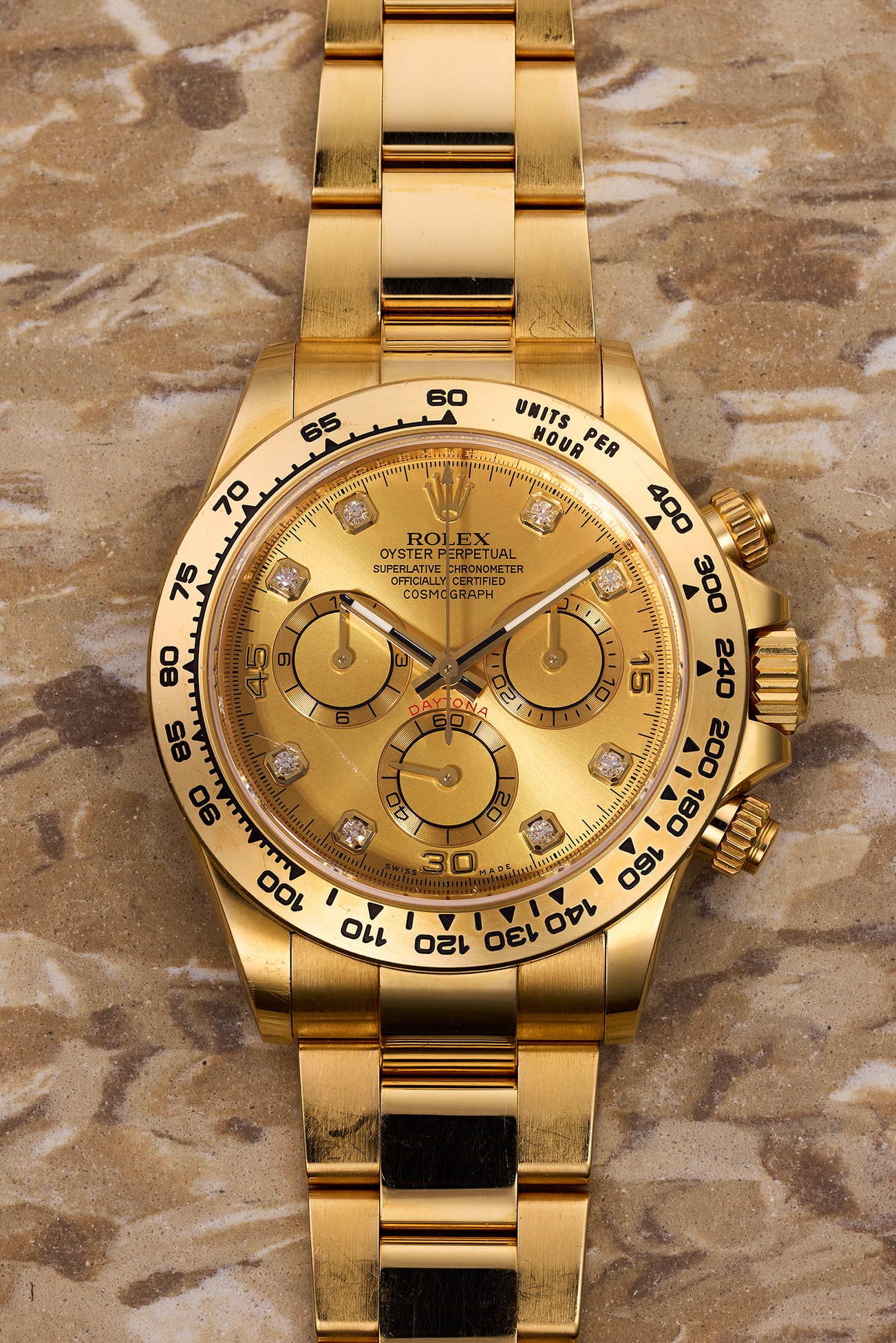 -- The reference 116508 was introduced in 2016 as an updated version of the reference 116528 the first yellow gold Daytona to house Rolex’s in-house caliber 4130. The reference 116508 features a 40mm diameter case with an updated bezel and clasp design. A distinct feature of the updated reference was the dial variety available including black, white and green examples along with champagne, like the present watch. Additionally, the dials featured luminous numerals or enhanced with diamond-set markers.