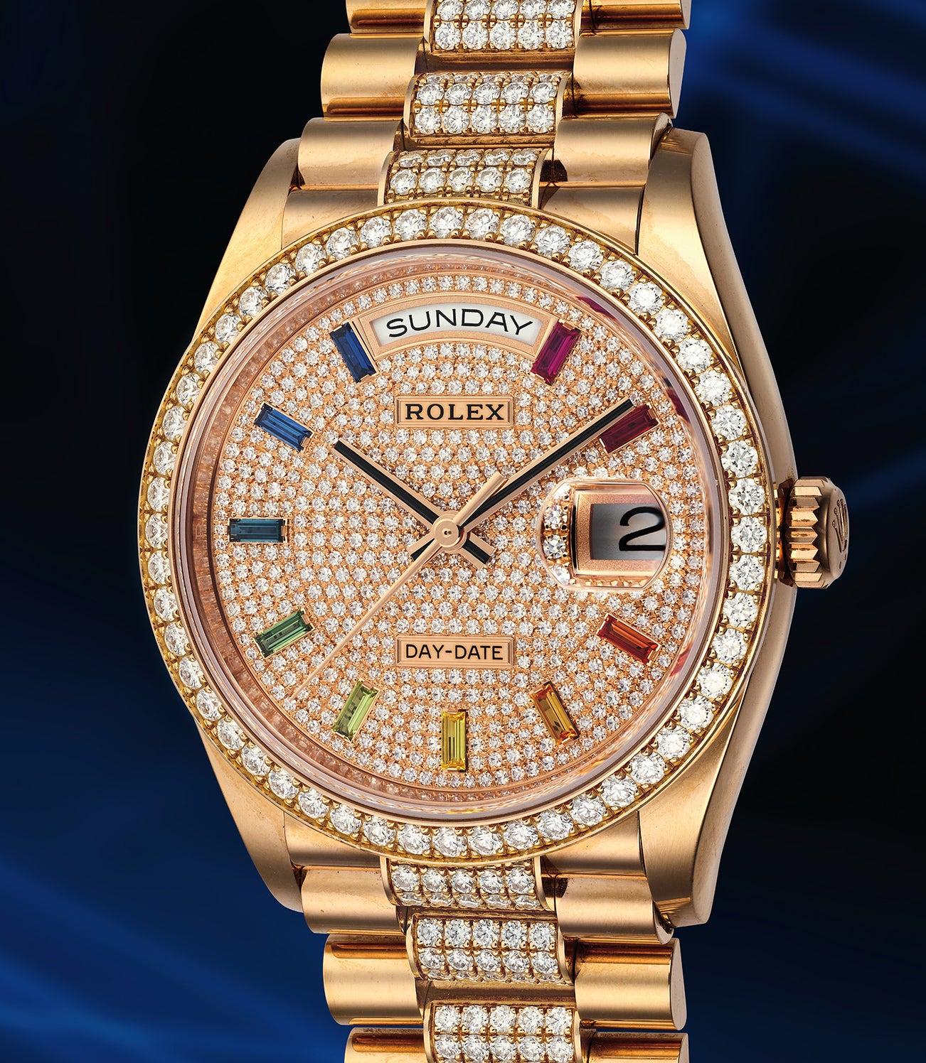 A dazzling and well-preserved pink gold and diamond-set wristwatch with day, date, bracelet, pavé diamond and gem-set dial, guarantee, and presentation box