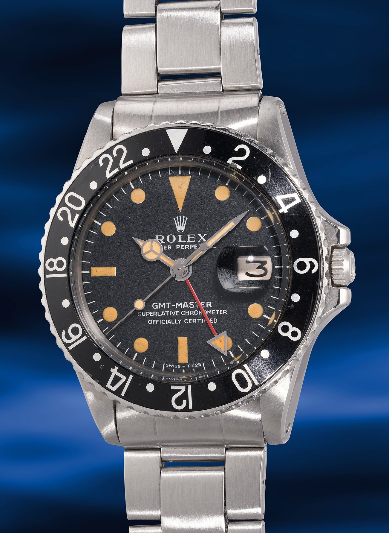 “Fresh to the market” consigned by the original owner, the present watch is exceptionally well-preserved with an attractive matte dial, bearing a 2.9 million serial case from approximately 1971. It represents a classic “Mark I” example identified by its distinguishable coronet and “long E” dial. It further displays the large triangle on the GMT hand. The black bezel insert is original, and the perfectly intact luminous hour markers have aged evenly to a pleasing tan color, giving the watch an elegant charisma and vintage appeal. It is fitted with a folded Oyster bracelet with clasp dated 1972. Property of a Japanese collector, this ref. 1675 is a charming example of a classic vintage GMT-Master.