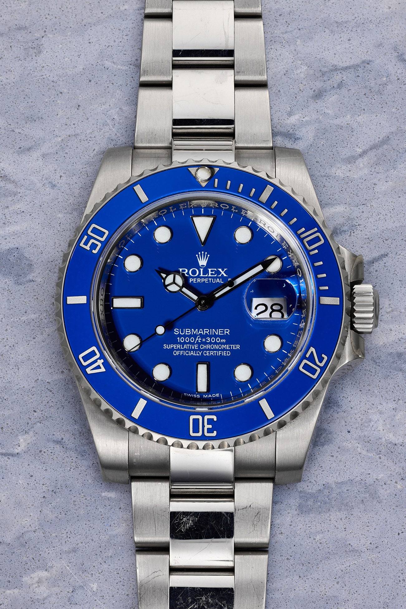 • These features include a scratch-resistant ceramic bezel in a vibrant aquatic blue with the numerals and markers coated in platinum. The vivid blue dial matches the bezel, and features hour markers and hands with white gold surrounds and Rolex’s luminescent Chromalight filling. Due to its proprietary white gold composition, alloyed in-house at Rolex’s foundries, the case and bracelet do not need to be re-plated with rhodium over time as is the case with typical 18K white gold jewelry and watches, but instead endures a warm silver lustre even with heavy use.