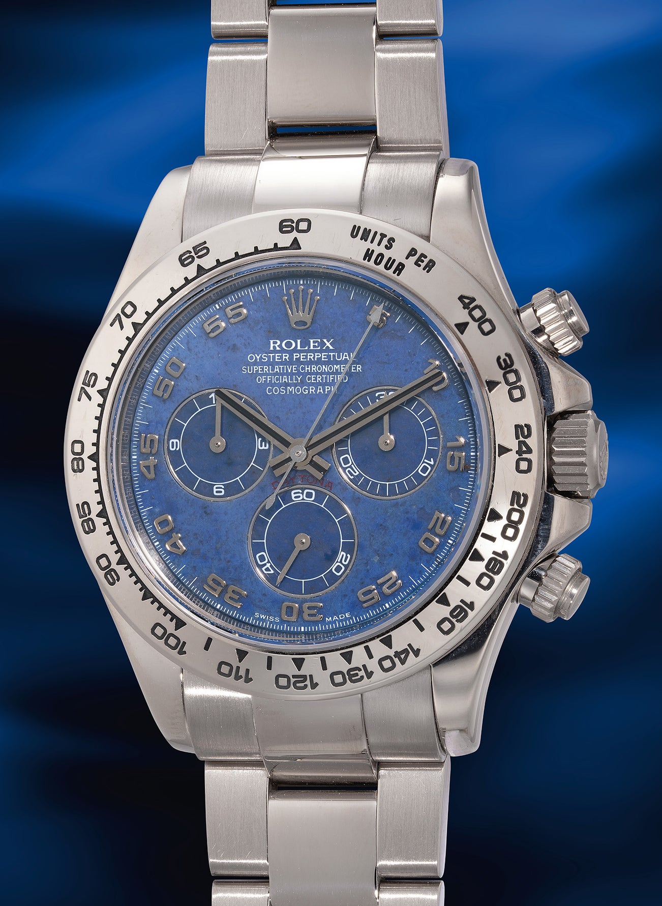 While most sodalite Daytona examples feature brilliant-cut diamond indexes, the present piece stands out with its intriguing Arabic 5-minute configuration, enhancing both practicality and readability while imparting a more subtle and elegant aesthetic. Exceptionally well-preserved, this combination of a white gold case and a sodalite hardstone dial is highly sought after within the collectors’ community, as the natural pattern of each dial is unique, making every piece truly one of a kind.