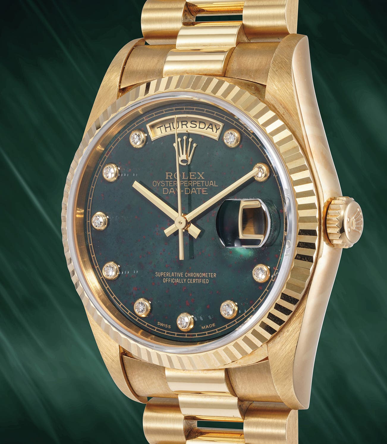 The present reference 18238 features an incredibly exotic and striking bloodstone dial that is defined by its forest green hue and playfully striking copper freckling throughout. The material perfectly contrasts with the warm gold case and round diamond markers for a powerful aesthetic result.