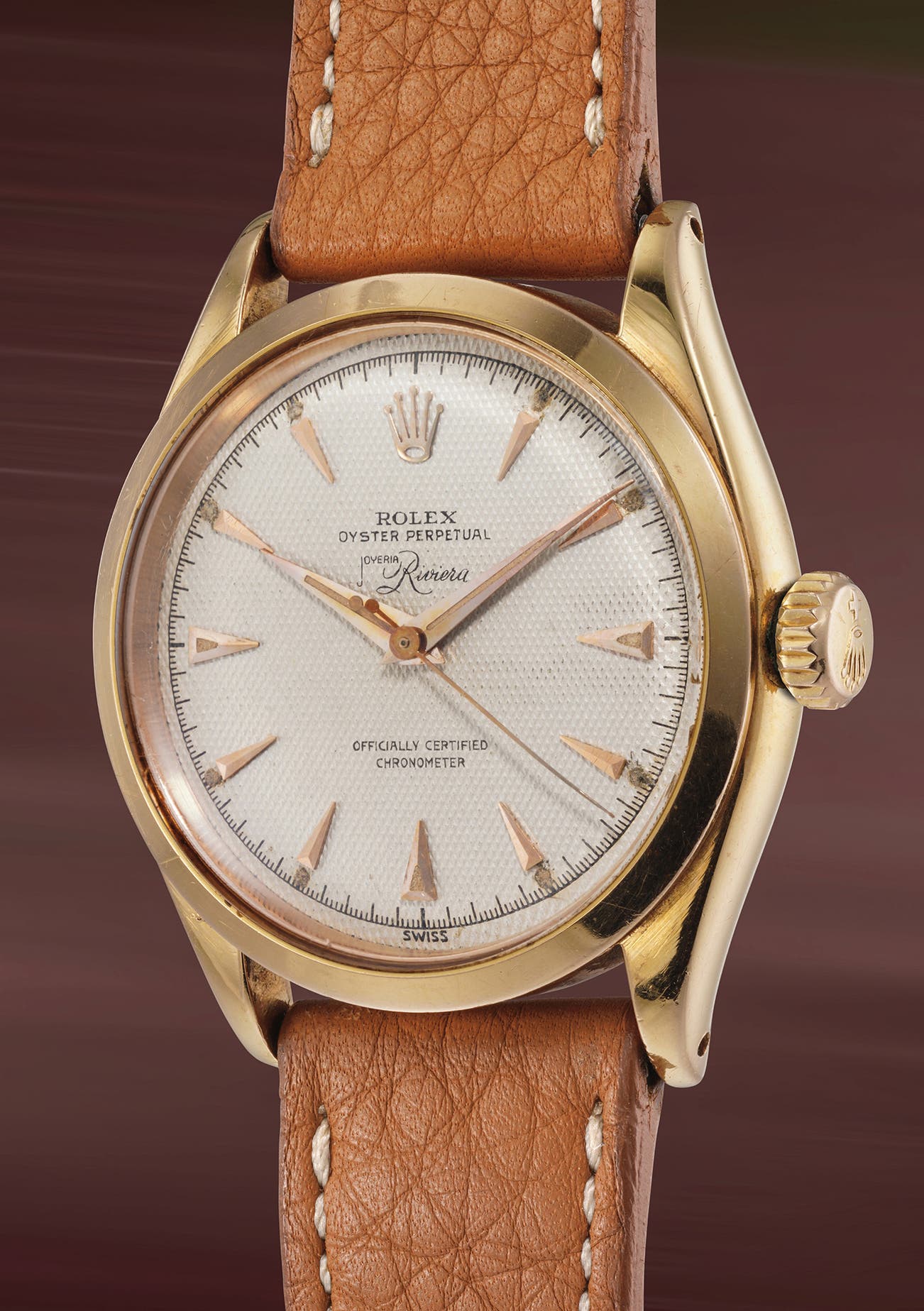 The seconds is the addition of the Joyeria Riviera signature on the dial, at 12 o'clock . In business since 1943 and based in Havana, Cuba, the famous shop has had the privilege of stamping their name on vintage Rolex watches, ranging from Killys, to Datejusts and even early chronograph models. Finally, the present watch is cased in pink gold which is rarer than its yellow gold counterparts.