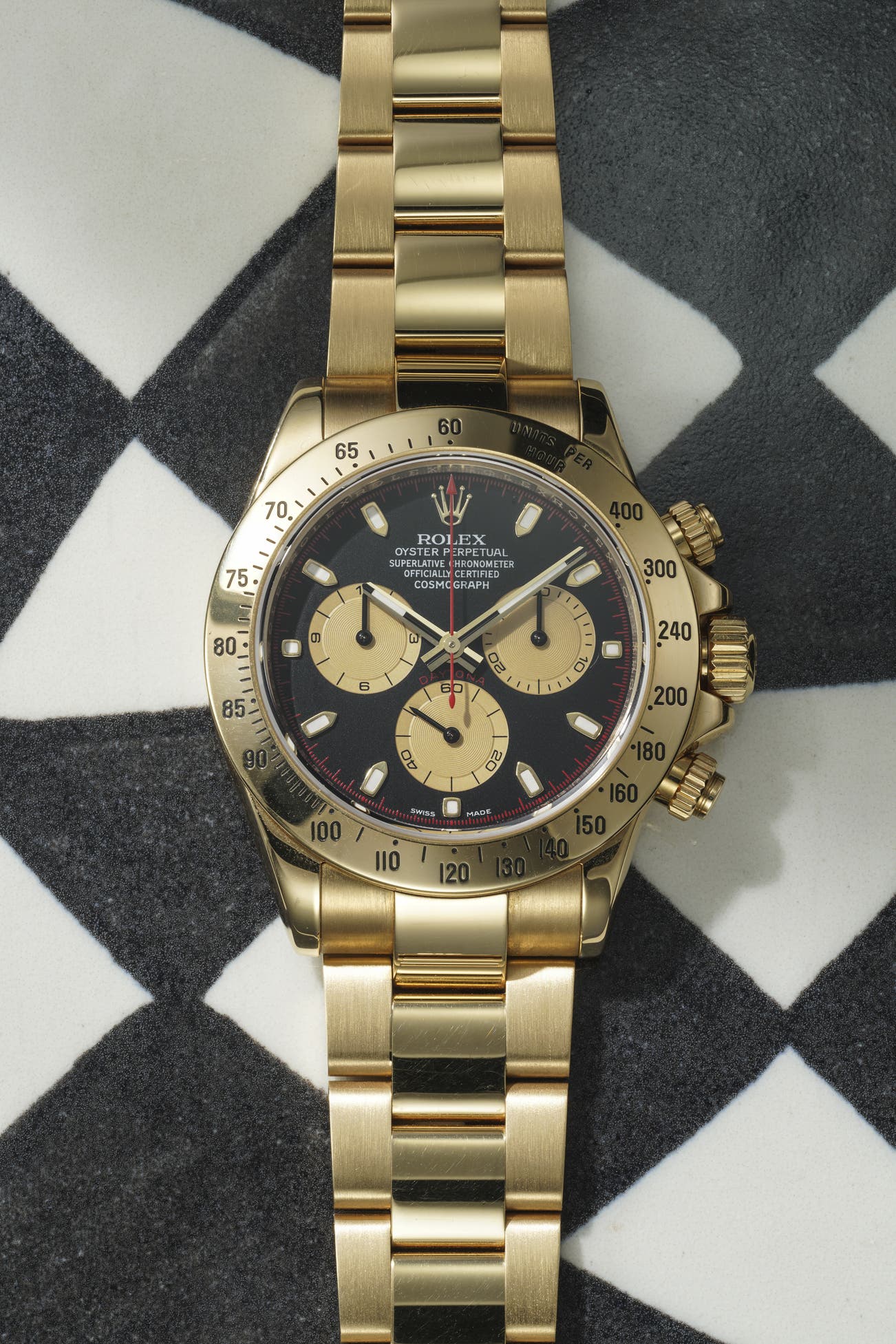 - An enormously charismatic timepiece, made even more regal by the luxurious yellow gold bracelet, the present example mounts a black dial with champagne counters and red outer divisions coupled with a red chronographic hands.