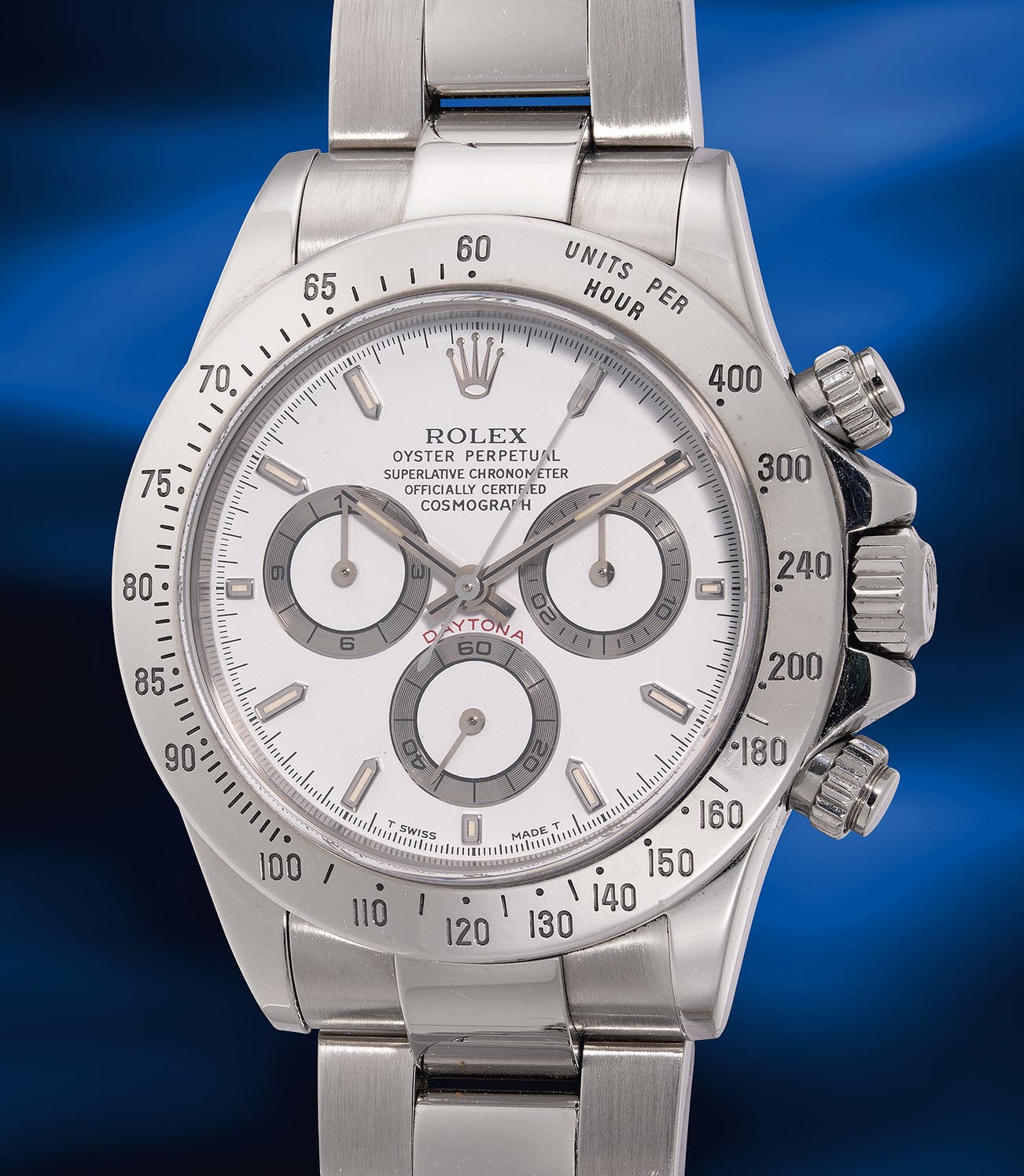 The present distinguished example, bearing a “P” serial case number from circa 2000, features a mysterious prototype dial known as the “Moonraker”. When the 6-digit Daytona was introduced, the text was repositioned to align more closely with the coronet. However, the transitional "Moonraker" dials retained the earlier layout of the ref. 16520, resulting in the sub-dials being positioned relatively close to the text. Furthermore, the dial is characterized by a white matte textured finish and tritium hour markers.