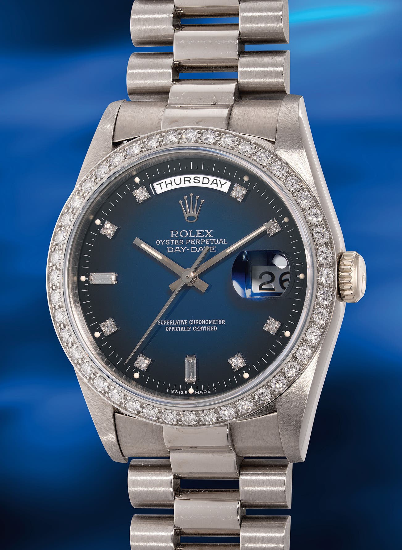 The present example, reference 18349, is notably crafted in white gold and features a stunning factory diamond-set bezel along with a President white gold bracelet. The "4" in the reference number signifies the diamond bezel, while the "9" indicates 18K white gold. Dating from circa 1990 with an “E” serial, this premium specimen boasts an exceptionally well-preserved case with sharp edges. The numbers between the lugs are deep and legible without the need for a loupe, as are the hallmarks beneath the lugs. Additionally, it is beautifully complemented by a rare blue gradient dial adorned with diamond-set indexes, making it a subtle yet elegant choice for any occasion.
