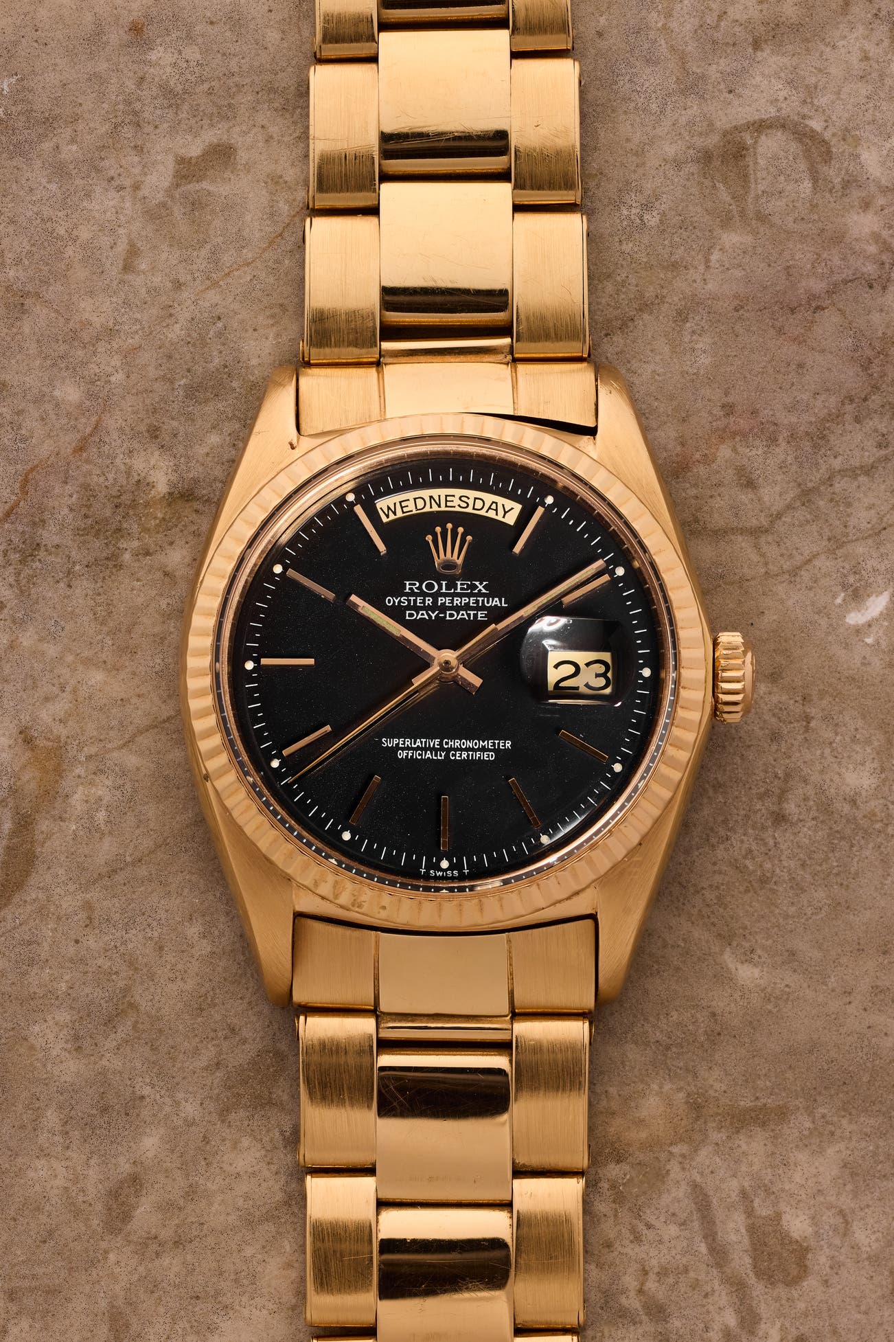 • An attractive combination in 18K pink gold, this Day-Date dates to 1968, and its black gloss dial remains inky and smooth.
